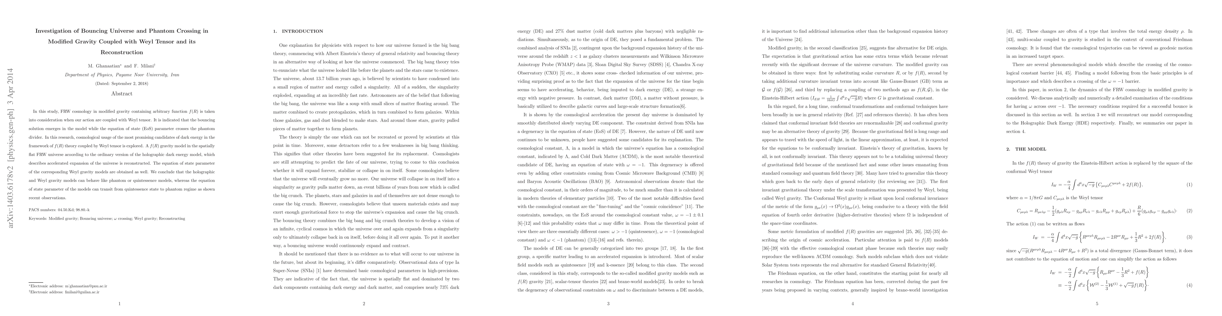 This study investigates modified gravity models with Weyl tensor, finding a 'bouncing universe' that crosses the phantom divider, and exploring its potential as an alternative to dark energy models.