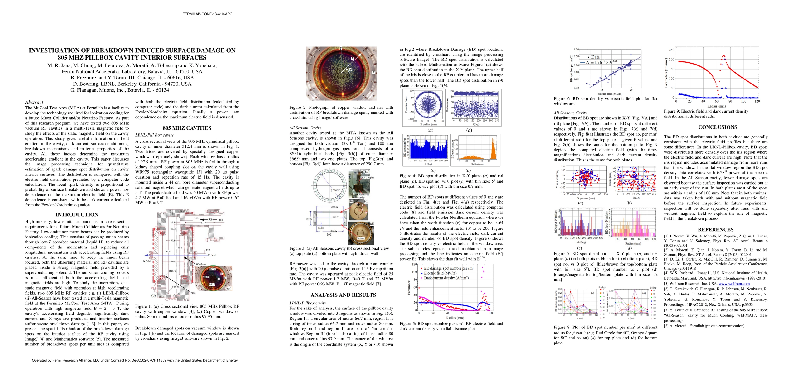 The MuCool Test Area (MTA) at Fermilab is a facility to develop the technology required for ionization cooling for a future Muon Collider and/or Neutrino Factory. As part of this research program, we have tested two 805 MHz vacuum RF cavities in a multi-Tesla magnetic field to study the effects of the static magnetic field on the cavity operation. This study gives useful information on field emitters in the cavity, dark current, surface conditioning, breakdown mechanisms and material properties of the cavity. All these factors determine the maximum accelerating gradient in the cavity. This paper discusses the image processing technique for quantitative estimation of spark damage spot distribution on cavity interior surfaces. The distribution is compared with the electric field distribution predicted by a computer code calculation. The local spark density is proportional to probability of surface breakdown and shows a power law dependence on the maximum electric field (E). This E dependence is consistent with the dark current calculated from the Fowler-Nordheim equation.