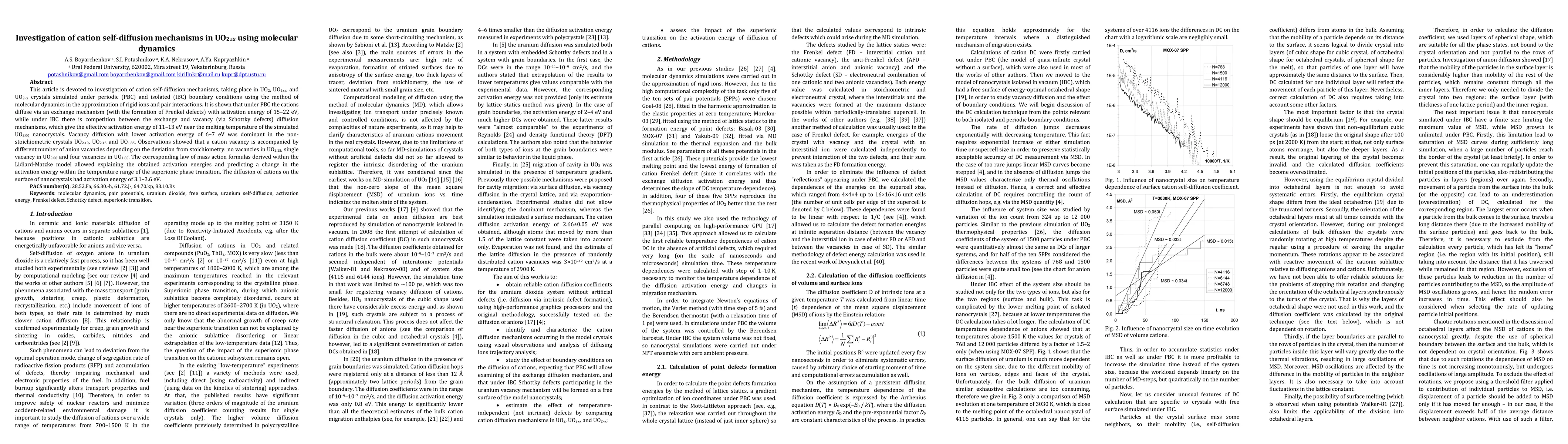 Development and application of molecular dynamics simulation methods for studying cation self-diffusion mechanisms in UO2+-x crystals.