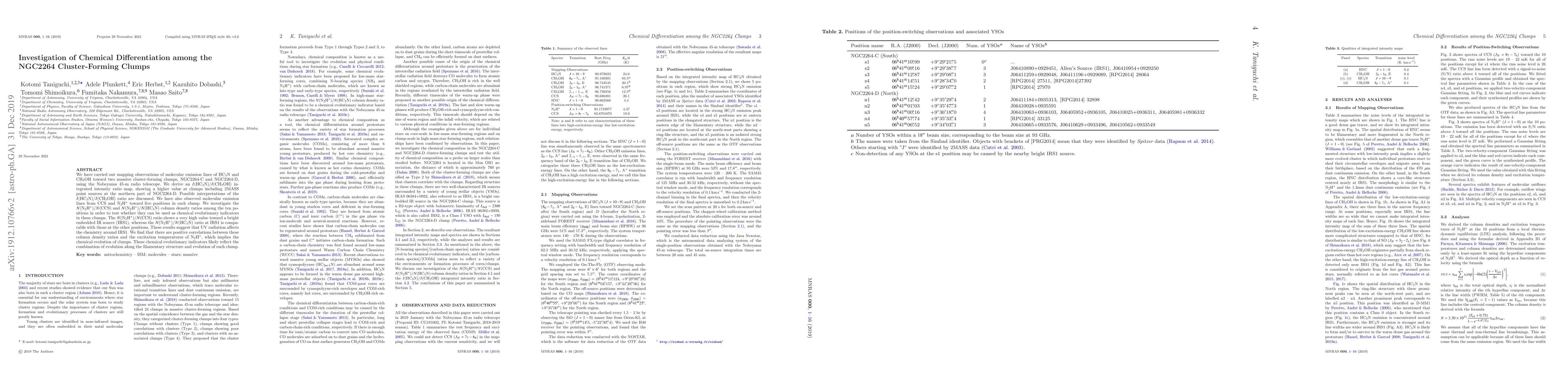 We have carried out mapping observations of molecular emission lines of HC$_{3}$N and CH$_{3}$OH toward two massive cluster-forming clumps, NGC2264-C and NGC2264-D, using the Nobeyama 45-m radio telescope. We derive an $I$(HC$_{3}$N)/$I$(CH$_{3}$OH) integrated intensity ratio map, showing a higher value at clumps including 2MASS point sources at the northern part of NGC2264-D. Possible interpretations of the $I$(HC$_{3}$N)/$I$(CH$_{3}$OH) ratio are discussed. We have also observed molecular emission lines from CCS and N$_{2}$H$^{+}$ toward five positions in each clump. We investigate the $N$(N$_{2}$H$^{+}$)/$N$(CCS) and $N$(N$_{2}$H$^{+}$)/$N$(HC$_{3}$N) column density ratios among the ten positions in order to test whether they can be used as chemical evolutionary indicators in these clumps. The $N$(N$_{2}$H$^{+}$)/$N$(CCS) ratio shows a very high value toward a bright embedded IR source (IRS1), whereas the $N$(N$_{2}$H$^{+}$)/$N$(HC$_{3}$N) ratio at IRS1 is comparable with those at the other positions. These results suggest that UV radiation affects the chemistry around IRS1. We find that there are positive correlations between these column density ratios and the excitation temperatures of N$_{2}$H$^{+}$, which implies the chemical evolution of clumps. These chemical evolutionary indicators likely reflect the combination of evolution along the filamentary structure and evolution of each clump.