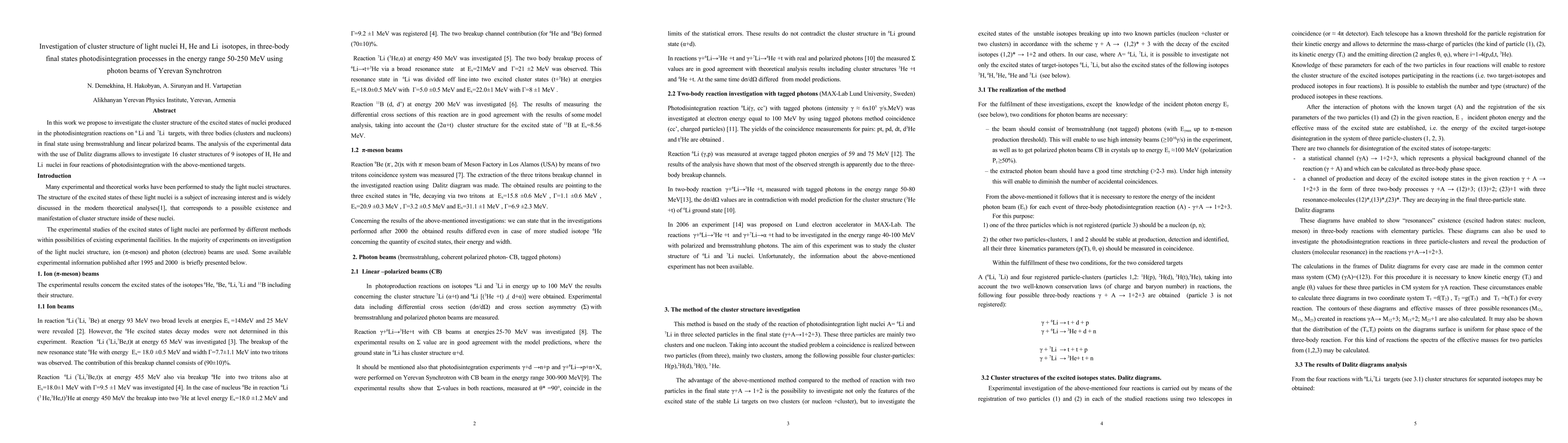 In this work we propose to investigate the cluster structure of the excited states of nuclei produced in the photodisintegration reactions on 6 Li and 7Li targets, with three bodies (clusters and nucleons) in final state using bremsstrahlung and linear polarized beams. The analysis of the experimental data with the use of Dalitz diagrams allows to investigate 16 cluster structures of 9 isotopes of H, He and Li nuclei in four reactions of photodisintegration with the above-mentioned targets.