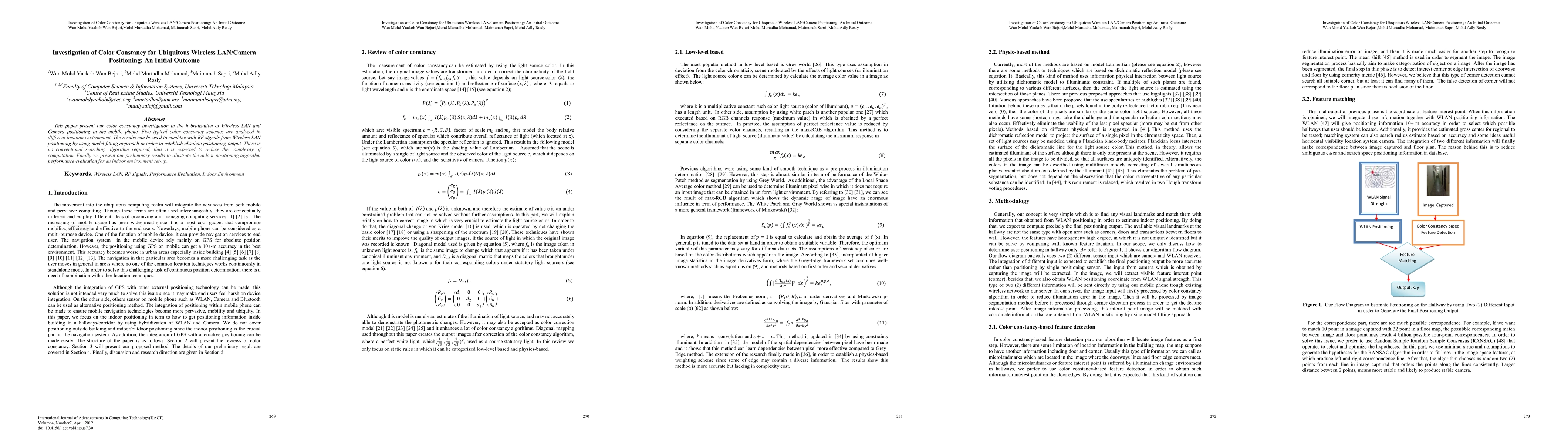 This paper investigates color constancy in the integration of Wireless LAN and camera positioning for mobile phones, analyzing five schemes in various environments. The study aims to reduce computational complexity by combining RF signals with model fitting, presenting preliminary results for indoor positioning performance.