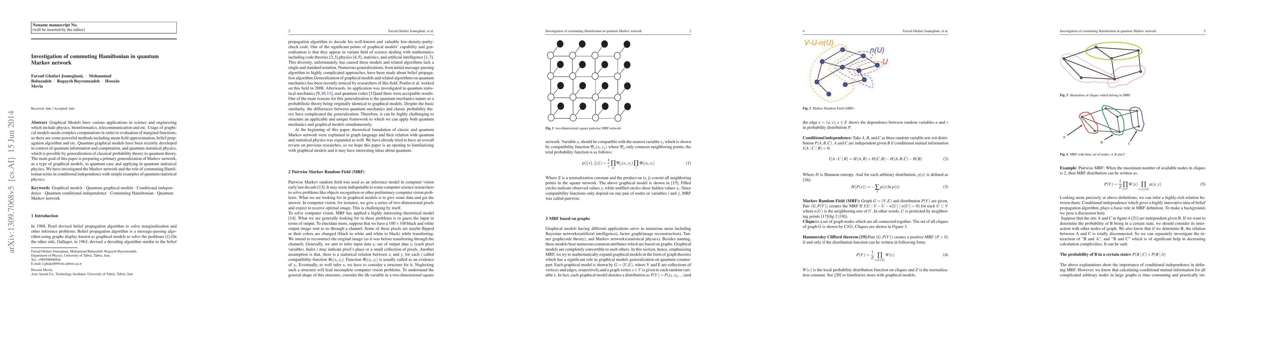 Graphical Models have various applications in science and engineering which include physics, bioinformatics, telecommunication and etc. Usage of graphical models needs complex computations in order to evaluation of marginal functions,so there are some powerful methods including mean field approximation, belief propagation algorithm and etc. Quantum graphical models have been recently developed in context of quantum information and computation, and quantum statistical physics, which is possible by generalization of classical probability theory to quantum theory. The main goal of this paper is preparing a primary generalization of Markov network, as a type of graphical models, to quantum case and applying in quantum statistical physics.We have investigated the Markov network and the role of commuting Hamiltonian terms in conditional independence with simple examples of quantum statistical physics.
