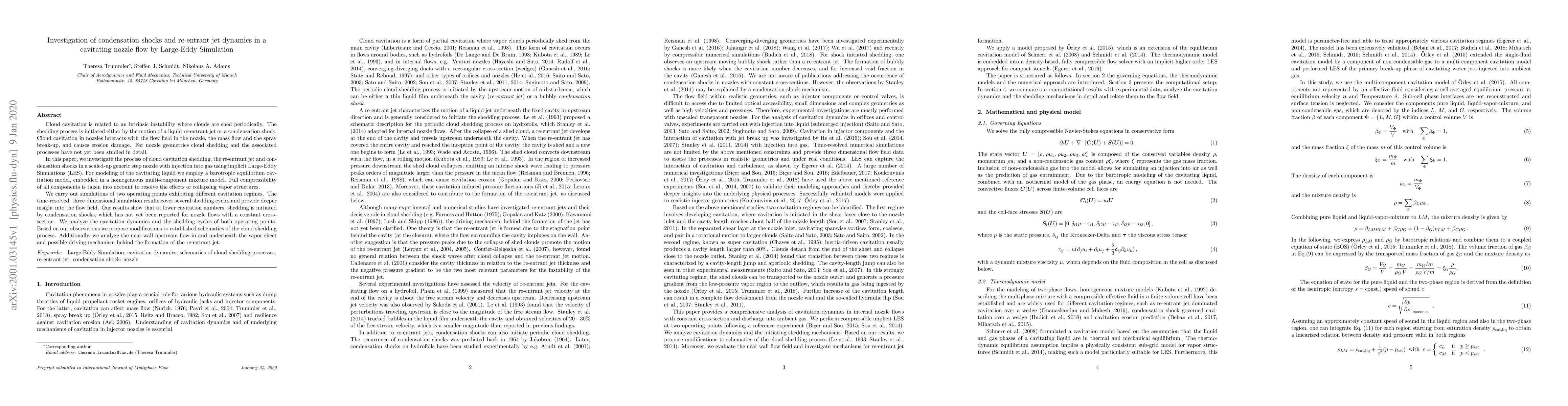 This paper investigates cloud cavitation shedding, re-entrant jet dynamics, and condensation shocks in a cavitating nozzle using Large-Eddy Simulations. The study reveals that at lower cavitation numbers, condensation shocks initiate shedding, a novel finding for constant cross-section nozzles, and proposes modifications to existing cloud shedding models.