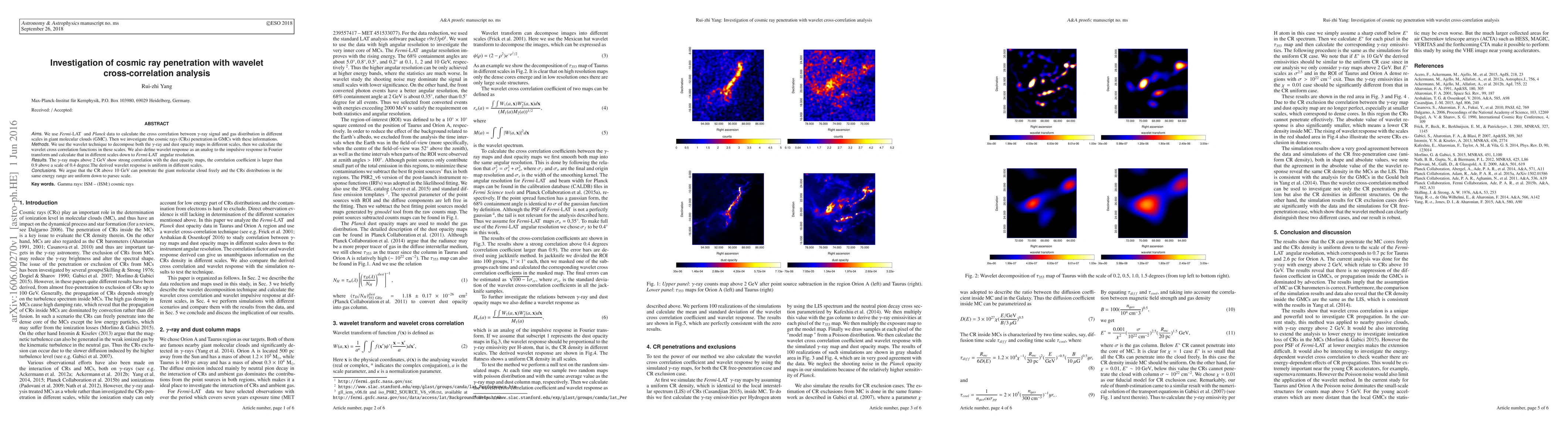 This paper investigates cosmic ray penetration in giant molecular clouds using Fermi and Planck data, employing wavelet cross-correlation analysis to correlate gamma ray signals with gas distribution. Results indicate strong correlation between gamma rays above 2 GeV and dust opacity, suggesting that cosmic rays above 10 GeV penetrate GMCs freely and uniformly.