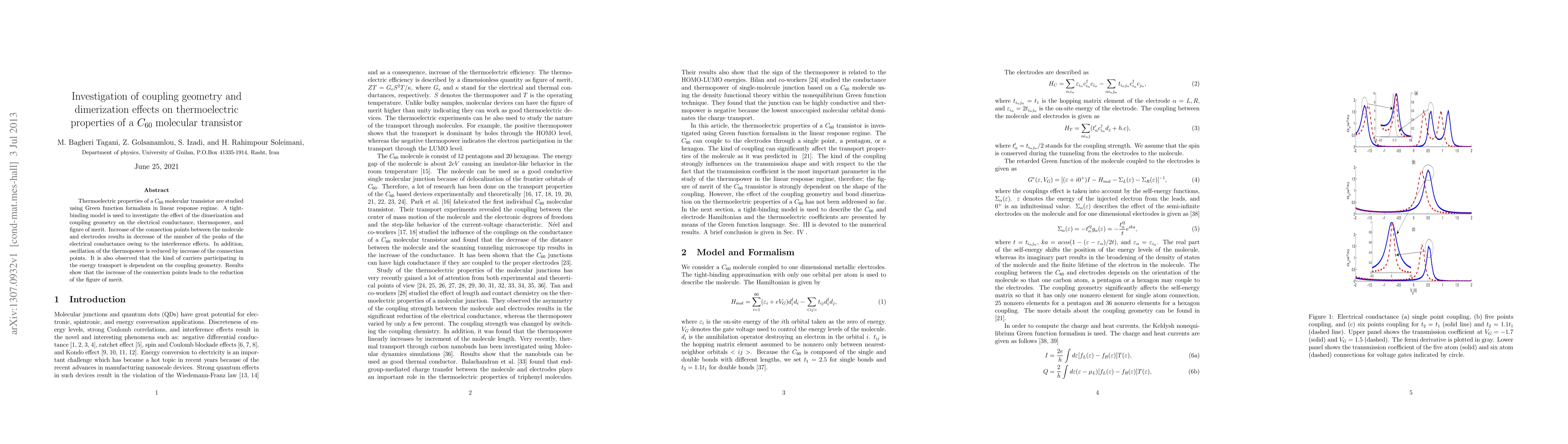 This study investigates how dimerization and coupling geometry affect the thermoelectric properties of a C60 molecular transistor using Green function formalism and a tight-binding model. Findings reveal that more connection points between the molecule and electrodes decrease electrical conductance peaks and thermopower oscillations, while reducing the figure of merit, and the type of carriers involved in energy transport is geometry-dependent.