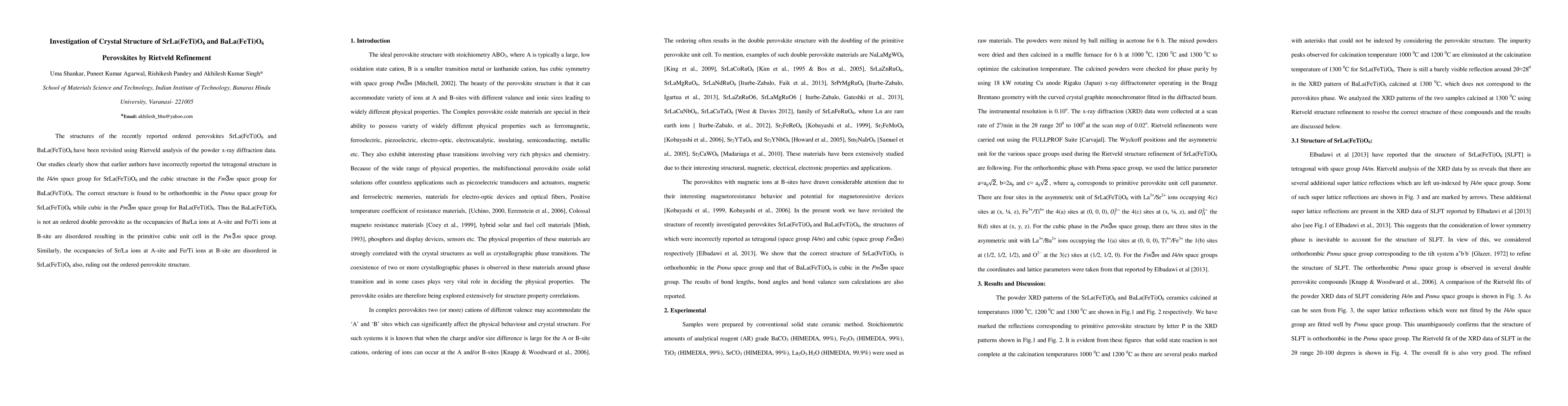 Researchers re-examined the crystal structures of SrLa(FeTi)O6 and BaLa(FeTi)O6 using Rietveld analysis, correcting earlier reports of tetragonal and cubic structures, finding instead orthorhombic and cubic structures respectively.