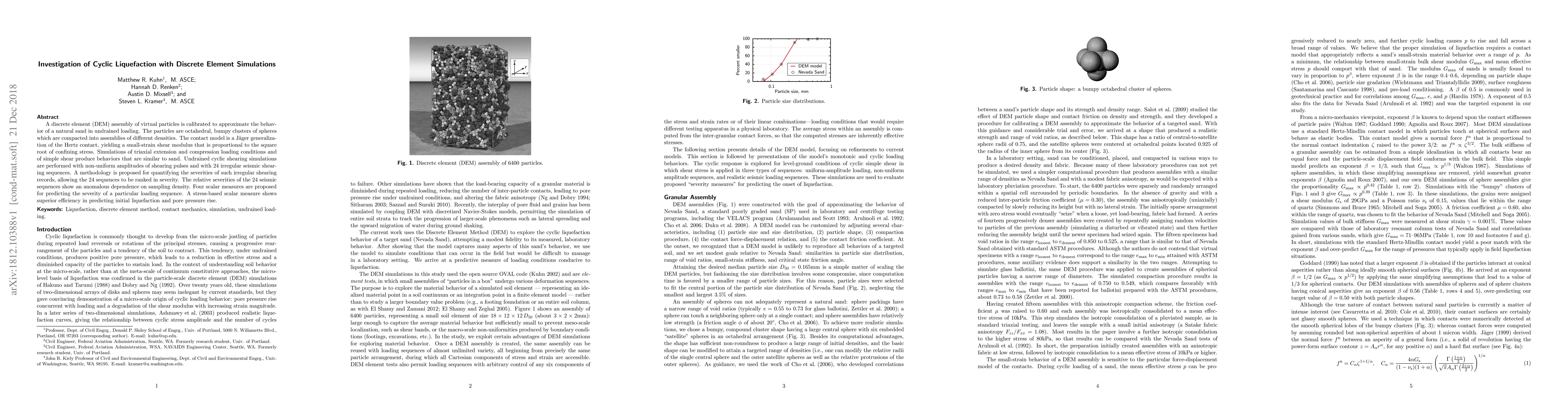A discrete-element method (DEM) assembly of virtual particles is calibrated to approximate the behavior of a natural sand in undrained loading. The particles are octahedral, bumpy clusters of spheres that are compacted into assemblies of different densities. The contact model is a Jager generalization of the Hertz contact, which yields a small-strain shear modulus that is proportional to the square root of confining stress. Simulations made of triaxial extension and compression loading conditions and of simple shear produce behaviors that are similar to sand. Undrained cyclic shearing simulations are performed with nonuniform amplitudes of shearing pulses and with 24 irregular seismic shearing sequences. A methodology is proposed for quantifying the severities of such irregular shearing records, allowing the 24 sequences to be ranked in severity. The relative severities of the 24 seismic sequences show an anomalous dependence on sampling density. Four scalar measures are proposed for predicting the severity of a particular loading sequence. A stress-based scalar measure shows superior efficiency in predicting initial liquefaction and pore pressure rise.