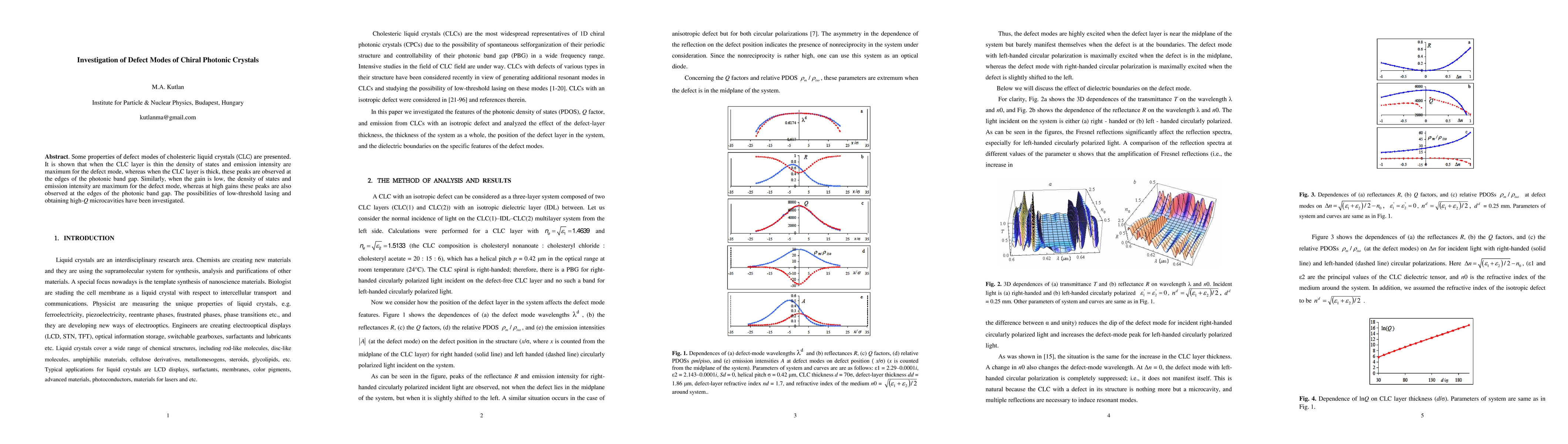 The paper investigates how defects in cholesteric liquid crystals (CLC) affect their properties, finding that the density of states and emission intensity peak at the edges of the photonic band gap under different conditions.