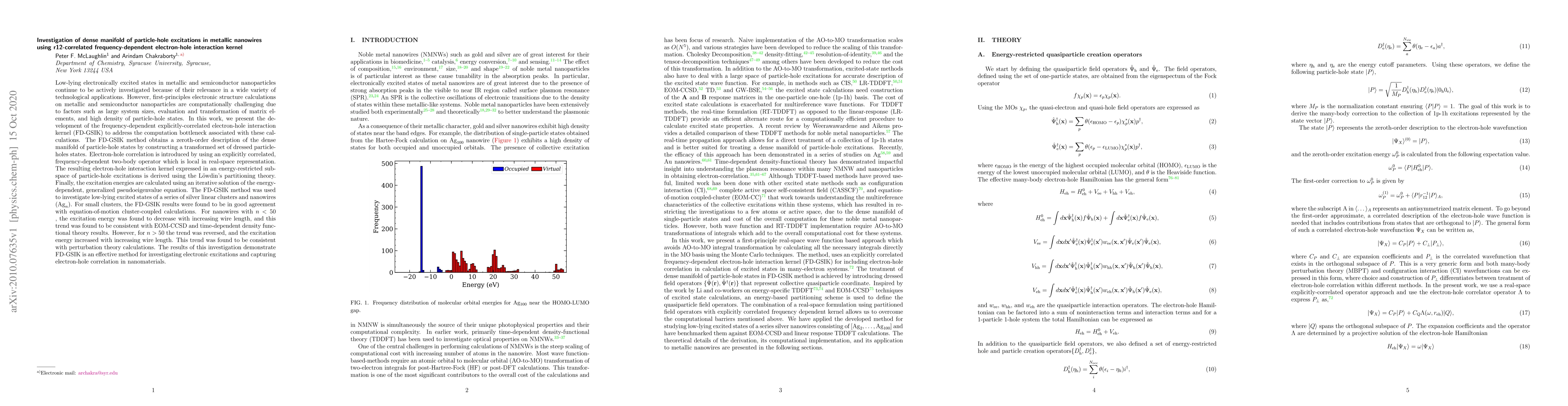 Low-lying electronically excited states in metallic and semiconductor nanoparticles continue to be actively investigated because of their relevance in a wide variety of technological applications. However, first-principles electronic structure calculations on metallic and semiconductor nanoparticles are computationally challenging due to factors such as large system sizes, evaluation and transformation of matrix elements, and high density of particle-hole states. In this work, we present the development of the frequency-dependent explicitly-correlated electron-hole interaction kernel (FD-GSIK) to address the computation bottleneck associated with these calculations. The FD-GSIK method obtains a zeroth-order description of the dense manifold of particle-hole states by constructing a transformed set of dressed particle-holes states. Electron-hole correlation is introduced by using an explicitly correlated, frequency-dependent two-body operator which is local in real-space representation. The resulting electron-hole interaction kernel expressed in an energy-restricted subspace of particle-hole excitations is derived using the Lowdin's partitioning theory. Finally, the excitation energies are calculated using an iterative solution of the energy-dependent, generalized pseudoeigenvalue equation. The FD-GSIK method was used to investigate low-lying excited states of a series of silver linear clusters and nanowires. The results from this investigation demonstrate that FD-GSIK is an effective method for investigating electronic excitations and capturing electron-hole correlation in nanomaterials.
