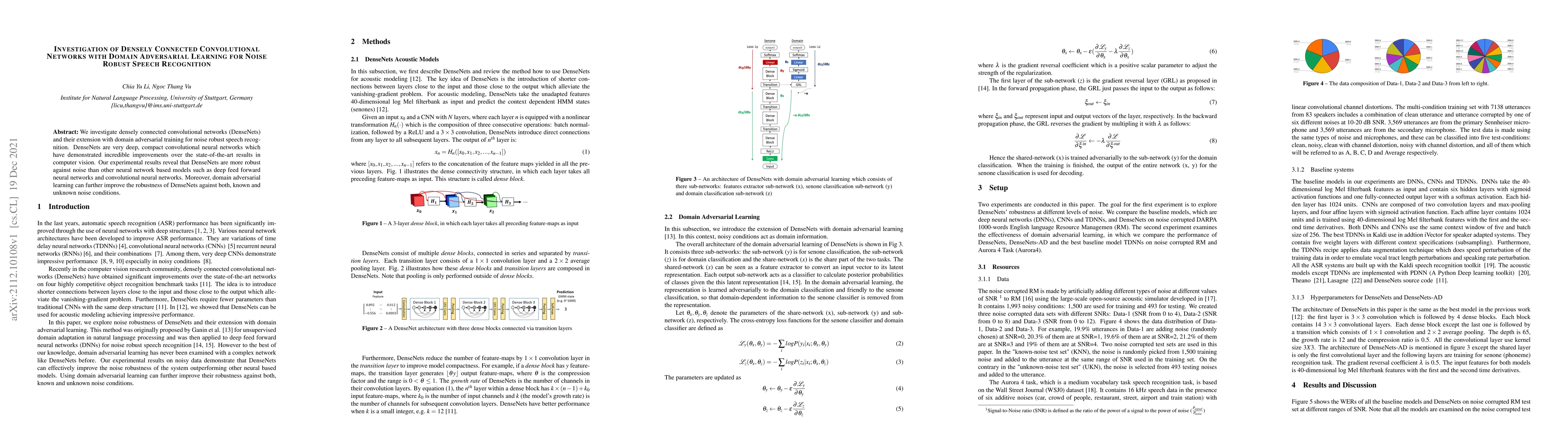 This paper explores the use of densely connected convolutional networks (DenseNets) combined with domain adversarial training to enhance noise-robust speech recognition. Experimental results show that DenseNets outperform other neural network models in noise conditions, and domain adversarial learning further boosts their robustness against both known and unknown noise.