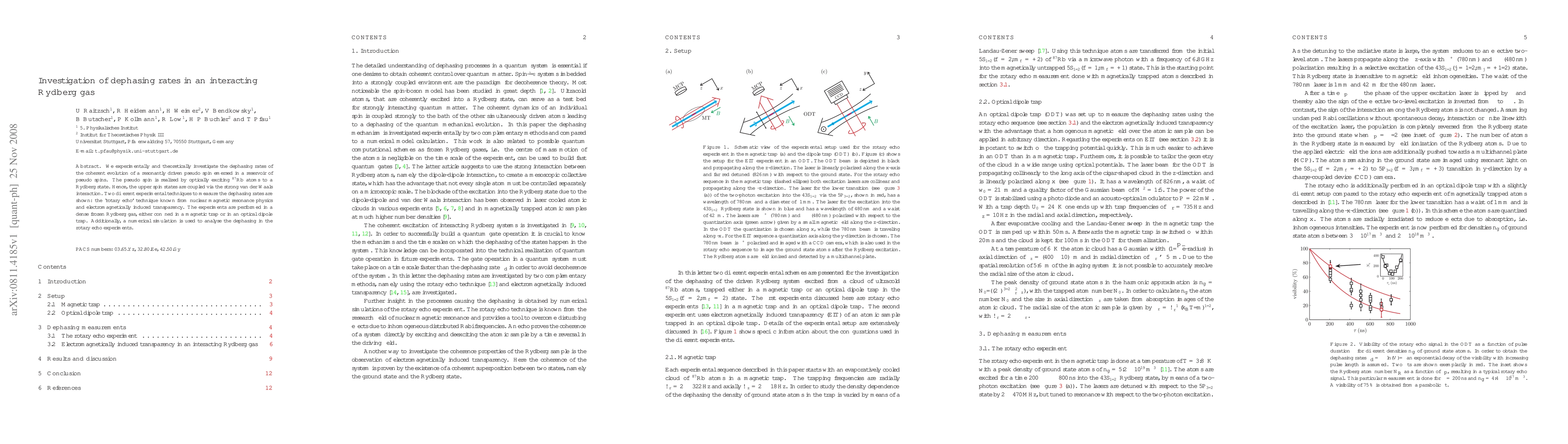 This paper investigates the dephasing rates in an interacting Rydberg gas using both experimental and theoretical methods. It employs the 'rotary echo' technique and electromagnetically induced transparency to measure dephasing in a system of pseudo spins realized by optically excited 87 Rb atoms, with strong van der Waals interactions coupling the upper spin states.