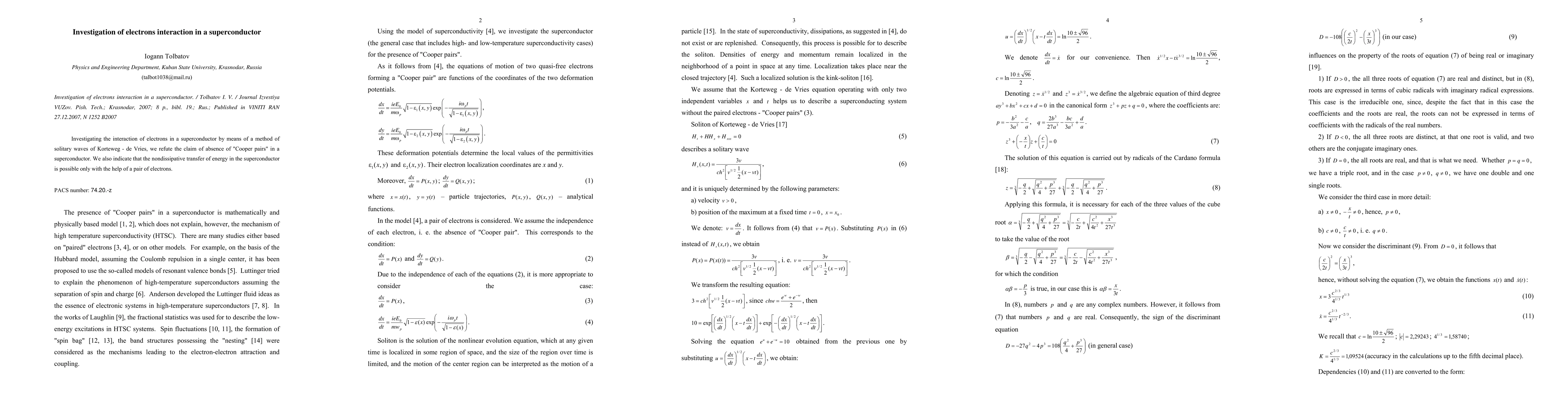 Investigating the interaction of electrons in a superconductor by means of a method of solitary waves of Korteweg - de Vries, we refute the claim of absence of "Cooper pairs" in a superconductor. We also indicate that the nondissipative transfer of energy in the superconductor is possible only with the help of a pair of electrons.