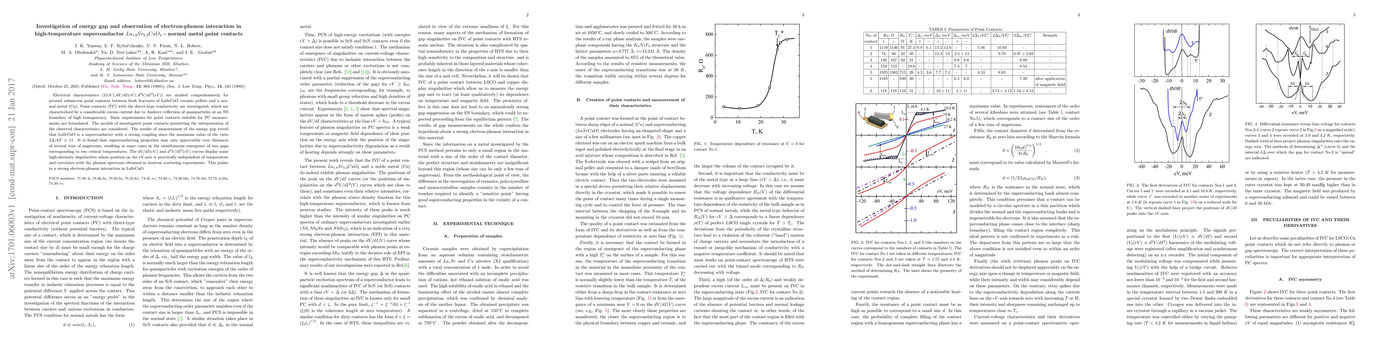 Electrical characteristics $(I(eV), dV/dI(eV), d^{2}V/dI^{2}(eV))$ are studied comprehensively for pressed submicron point contacts between fresh fractures of LaSrCuO ceramic pellets and a normal metal (Cu). Point contacts (PC) with the direct-type conductivity are investigated, which are characterized by a considerable excess current due to Andreev reflection of quasiparticles at an NS boundary of high transparency. Basic requirements for point contacts suitable for PC measurements are formulated. The models of investigated point contacts permitting the interpretation of the observed characteristics are considered. The results of measurement of the energy gap reveal that LaSrCuO is a superconductor with a strong coupling since the maximum value of the ratio $2\Delta/kT\simeq 11$. It is found that superconducting properties may vary appreciably over distances of several tens of angstroms, resulting in some cases in the simultaneous emergence of two gaps corresponding to two critical temperatures. The $dV/dI(eV)$ and $d^{2}V/dI^{2}(eV)$ curves display some high-intensity singularities whose position on the eV-axis is practically independent of temperature and correlates with the phonon spectrum obtained in neutron scattering experiments. This points to a strong electron-phonon interaction in LaSrCuO.