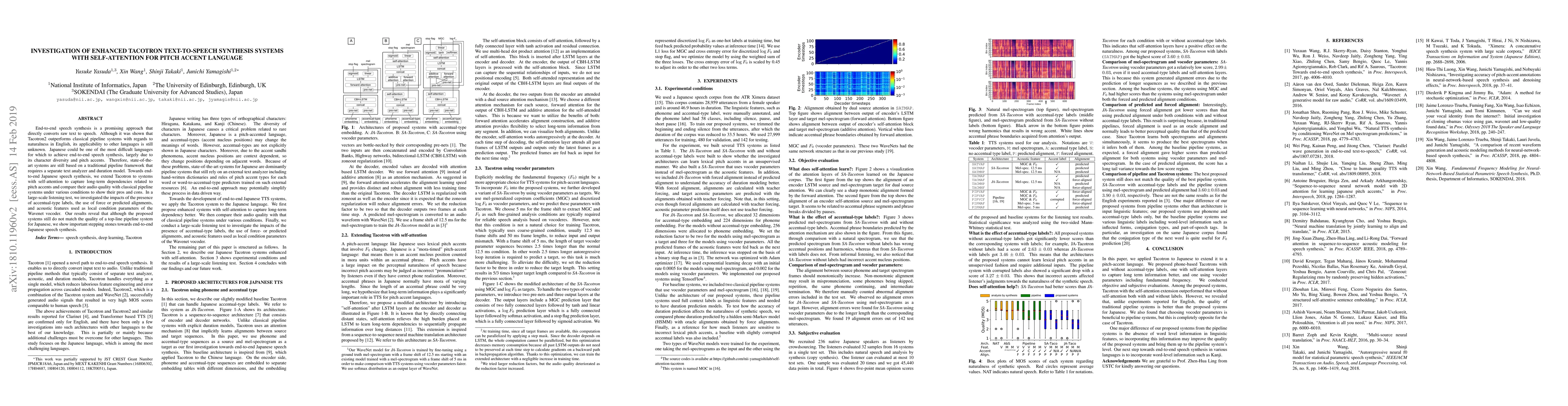 This paper investigates enhanced Tacotron2 text-to-speech systems using self-attention for Japanese speech synthesis, aiming to address pitch accents and long-term dependencies. While the proposed end-to-end systems show promise, they still fall short of traditional pipeline systems in quality, indicating potential for future improvements.