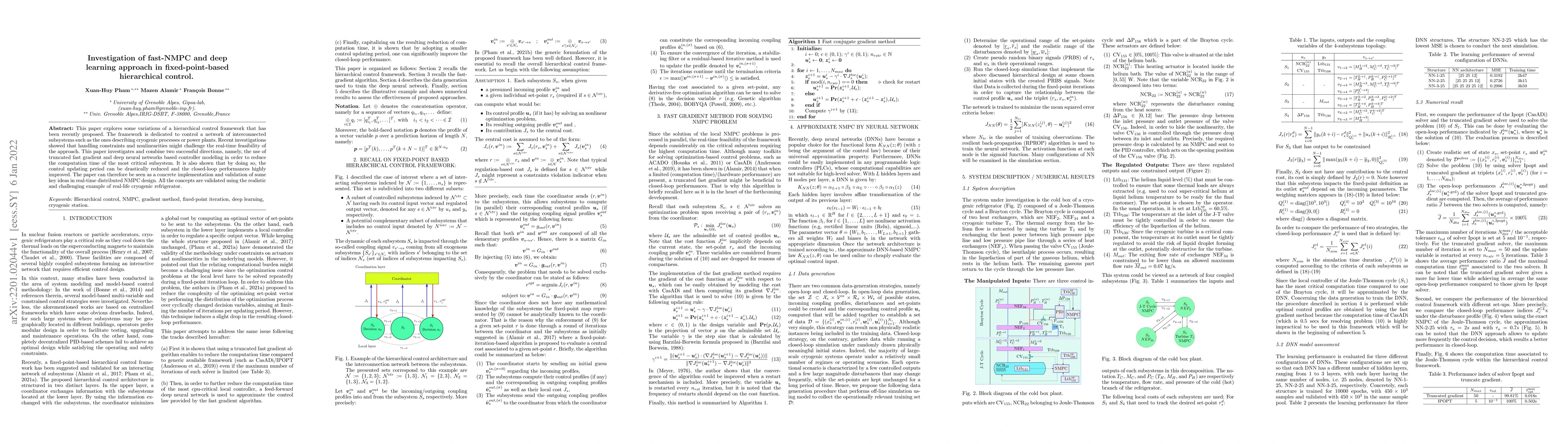 This paper explores some variations of a hierarchical control framework that has been recently proposed. The framework is dedicated to control a network of interconnected subsystems such as the ones describing cryogenic processes or power plants. Recent investigations showed that handling constraints and nonlinearities might challenge the real-time feasibility of the approach. This paper investigates and combine two successful directions, namely, the use of truncated fast gradient and deep neural networks based controller modeling in order to reduce the computation time of the most critical subsystem. It is also shown that by doing so, the control updating period can be drastically reduced and the closed-loop performances highly improved. The paper can therefore be seen as a concrete implementation and validation of some key ideas in real-time distributed NMPC design. All the concepts are validated using the realistic and challenging example of real-life cryogenic refrigerator.
