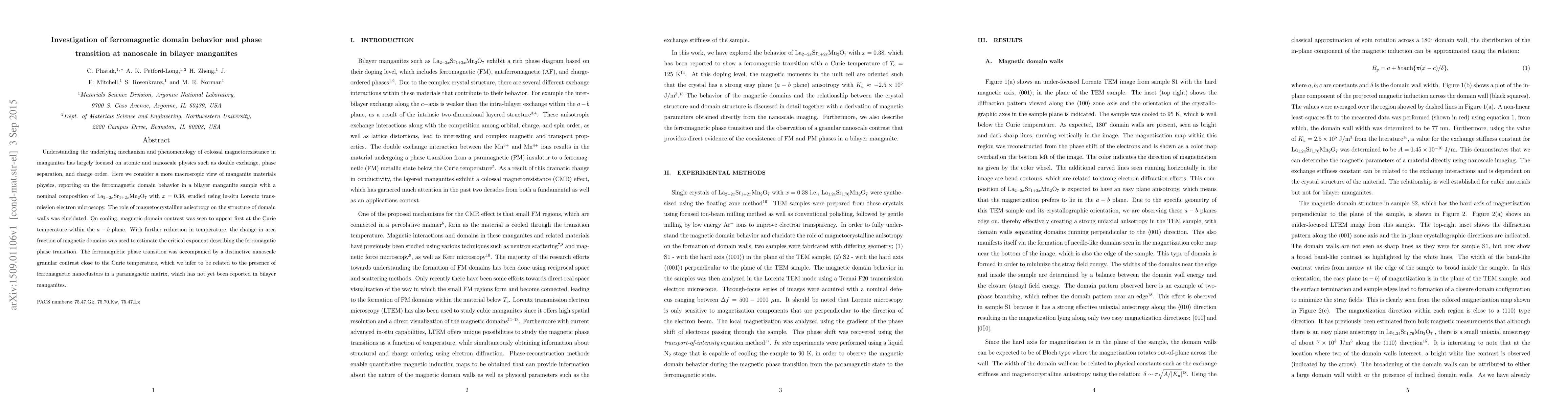 Understanding the underlying mechanism and phenomenology of colossal magnetoresistance in manganites has largely focused on atomic and nanoscale physics such as double exchange, phase separation, and charge order. Here we consider a more macroscopic view of manganite materials physics, reporting on the ferromagnetic domain behavior in a bilayer manganite sample with a nominal composition of La$_{2-2x}$Sr$_{1+2x}$Mn$_2$O$_7$ with $x=0.38$, studied using in-situ Lorentz transmission electron microscopy. The role of magnetocrystalline anisotropy on the structure of domain walls was elucidated. On cooling, magnetic domain contrast was seen to appear first at the Curie temperature within the $a-b$ plane. With further reduction in temperature, the change in area fraction of magnetic domains was used to estimate the critical exponent describing the ferromagntic phase transition. The ferromagnetic phase transition was accompanied by a distinctive nanoscale granular contrast close to the Curie temperature, which we infer to be related to the presence of ferromagnetic nanoclusters in a paramagnetic matrix, which has not yet been reported in bilayer manganites.