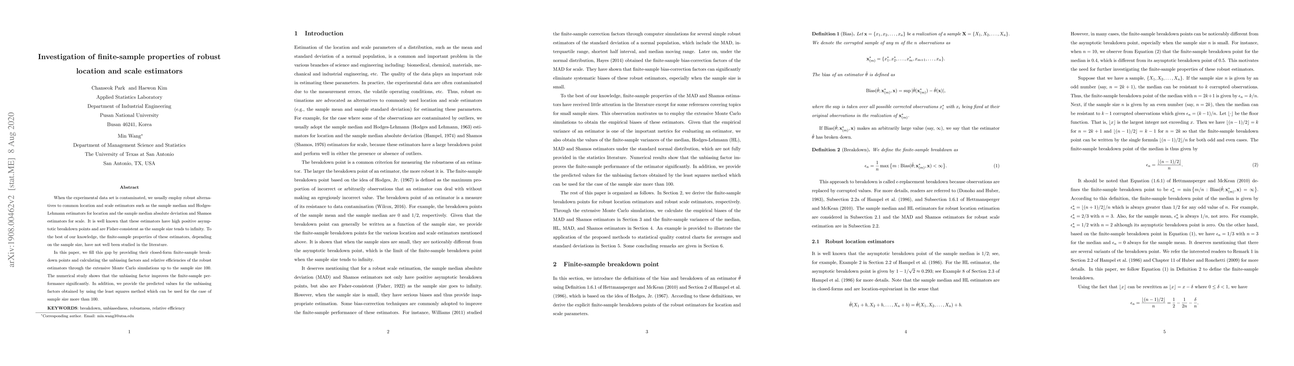This paper investigates the finite-sample performance of robust location and scale estimators, such as the sample median and Hodges-Lehmann estimators, through Monte Carlo simulations up to sample size 100. It provides closed-form breakdown points and calculates unbiasing factors, showing significant improvements in performance, and predicts unbiasing factors for larger sample sizes using least squares.
