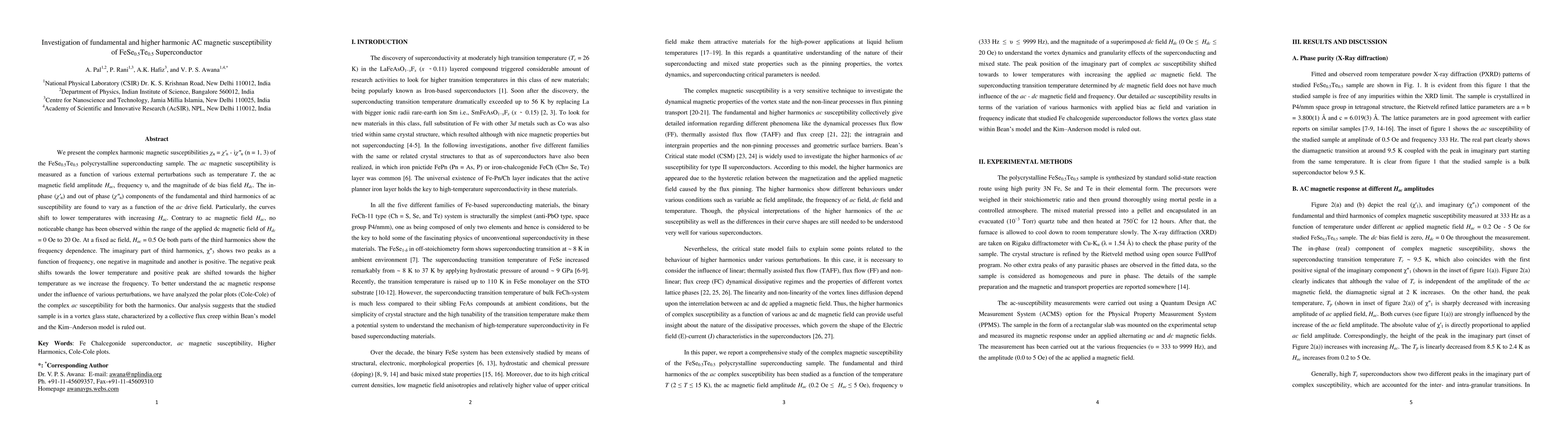 We present the complex harmonic magnetic susceptibilities of the FeSeTe polycrystalline superconducting sample. The ac magnetic susceptibility is measured as a function of various external perturbations such as temperature, the AC magnetic field amplitude, frequency, and the magnitude of DC bias field. The in phase and out of phase components of the fundamental and third harmonics of ac susceptibility are found to vary as a function of the AC drive field. The imaginary part of third harmonics shows two peaks as a function of frequency, one negative in magnitude and another is positive. The negative peak shifts towards the lower temperature and positive peak is shifted towards the higher temperature as we increase the frequency. To better understand the AC magnetic response under the influence of various perturbations, we have analyzed the polar plot of the complex ac susceptibility for both the harmonics. Our analysis suggests that the studied sample is in vortex glass state, characterized by a collective flux creep state within Beans model and the Kim Anderson model is ruled out.