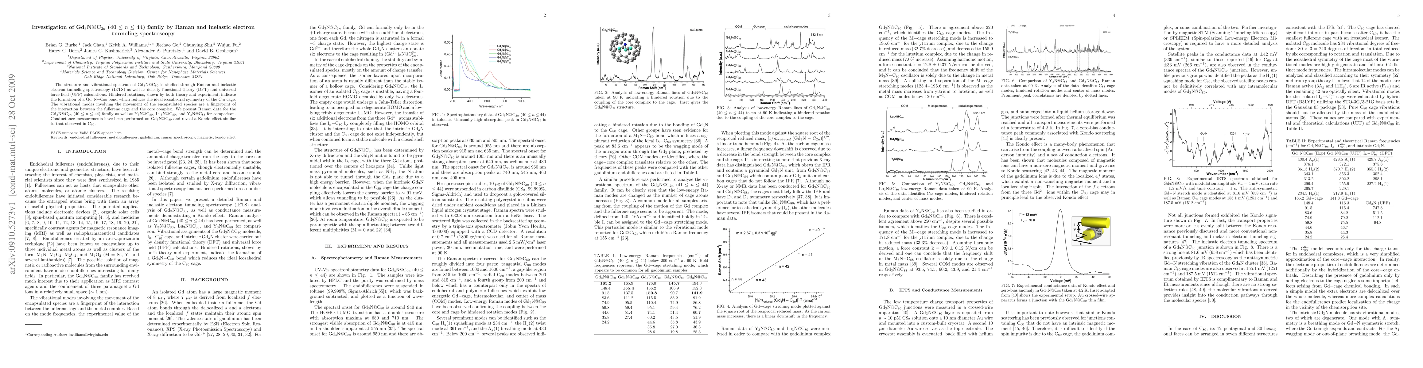 The structure and vibrational spectrum of Gd3N@C80 is studied through Raman and inelastic electron tunneling spectroscopy (IETS) as well as density functional theory (DFT) and universal force field (UFF) calculations. Hindered rotations, shown by both theory and experiment, indicate the formation of a Gd3N-C80 bond which reduces the ideal icosahedral symmetry of the C80 cage. The vibrational modes involving the movement of the encapsulated species are a fingerprint of the interaction between the fullerene cage and the core complex. We present Raman data for the Gd3N@C2n (40 < n < 44) family as well as Y3N@C80, Lu3N@C80, and Y3N@C88 for comparison. Conductance measurements have been performed on Gd3N@C80 and reveal a Kondo effect similar to that observed in C60.