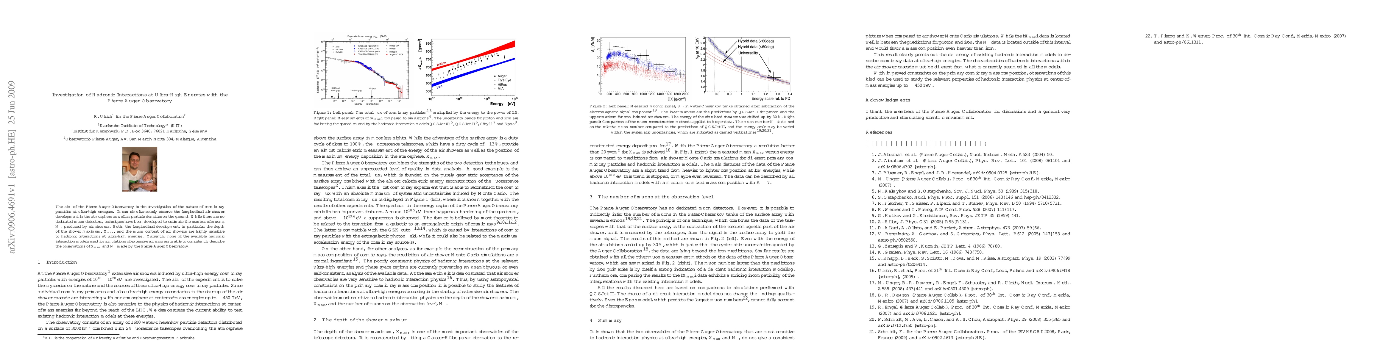The Pierre Auger Observatory investigates ultra-high energy cosmic rays, observing air shower development and estimating muon content. Current hadronic interaction models fail to consistently describe observations of shower maximum depth and muon density.