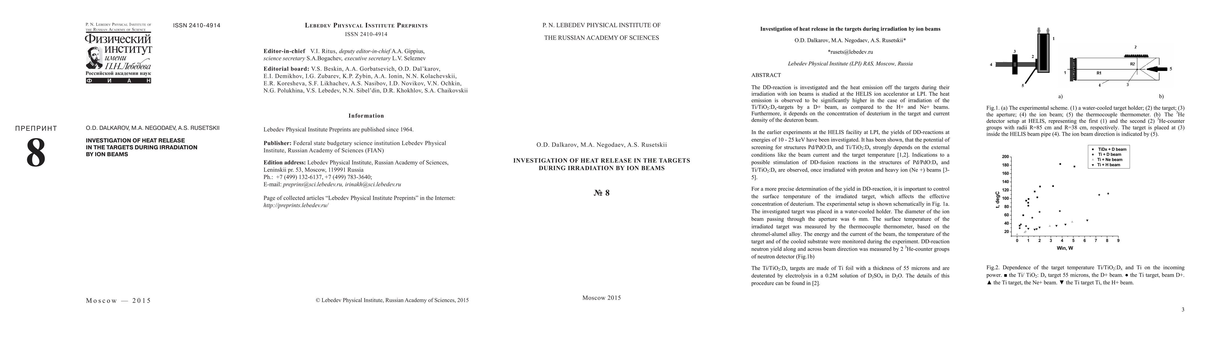 The DD-reaction is investigated and the heat emission off the targets during their irradiation with ion beams is studied at the HELIS ion accelerator at LPI. The heat emission is observed to be significantly higher in the case of irradiation of the Ti/TiO2:Dx-targets by a D+ beam, as compared to the H+ and Ne+ beams. Furthermore, it depends on the concentration of deuterium in the target and current density of the deuteron beam.