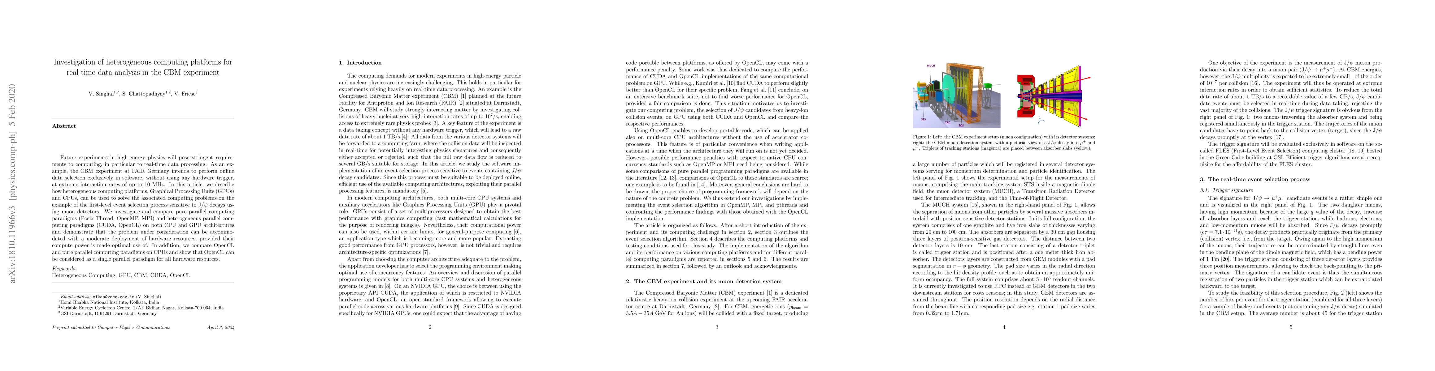 Future experiments in high-energy physics will pose stringent requirements to computing, in particular to real-time data processing. As an example, the CBM experiment at FAIR Germany intends to perform online data selection exclusively in software, without using any hardware trigger, at extreme interaction rates of up to 10 MHz. In this article, we describe how heterogeneous computing platforms, Graphical Processing Units (GPUs) and CPUs, can be used to solve the associated computing problems on the example of the first-level event selection process sensitive to J/{\psi} decays using muon detectors. We investigate and compare pure parallel computing paradigms (Posix Thread, OpenMP, MPI) and heterogeneous parallel computing paradigms (CUDA, OpenCL) on both CPU and GPU architectures and demonstrate that the problem under consideration can be accommodated with a moderate deployment of hardware resources, provided their compute power is made optimal use of. In addition, we compare OpenCL and pure parallel computing paradigms on CPUs and show that OpenCL can be considered as a single parallel paradigm for all hardware resources.