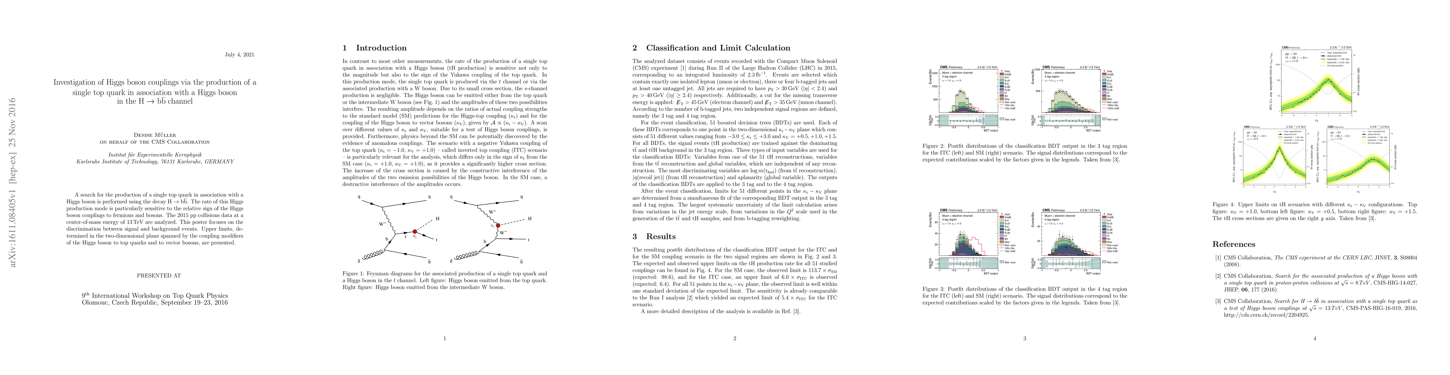 A search for the production of a single top quark in association with a Higgs boson is performed using the decay $\text{H} \to \text{b} \bar{\text{b}}$. The rate of this Higgs production mode is particularly sensitive to the relative sign of the Higgs boson couplings to fermions and bosons. The 2015 pp collisions data at a center-of-mass energy of 13 TeV are analyzed. This poster focuses on the discrimination between signal and background events. Upper limits, determined in the two-dimensional plane spanned by the coupling modifiers of the Higgs boson to top quarks and to vector bosons, are presented.
