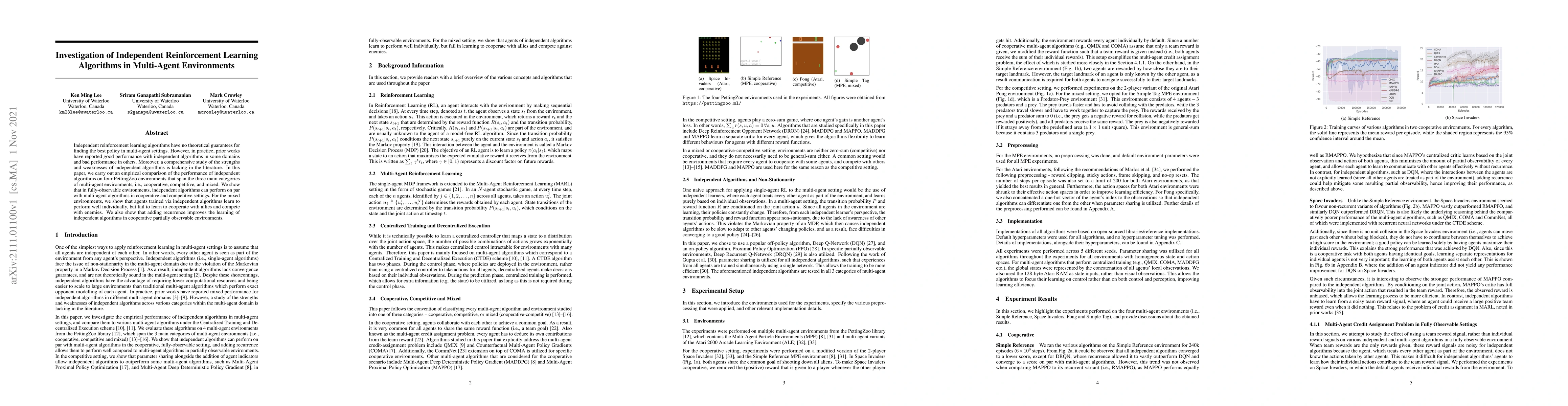 This paper investigates the performance of independent reinforcement learning algorithms across various multi-agent environments, finding they perform well in cooperative and competitive settings but struggle in mixed environments where cooperation and competition are both required. Adding recurrence enhances performance in cooperative partially observable scenarios.