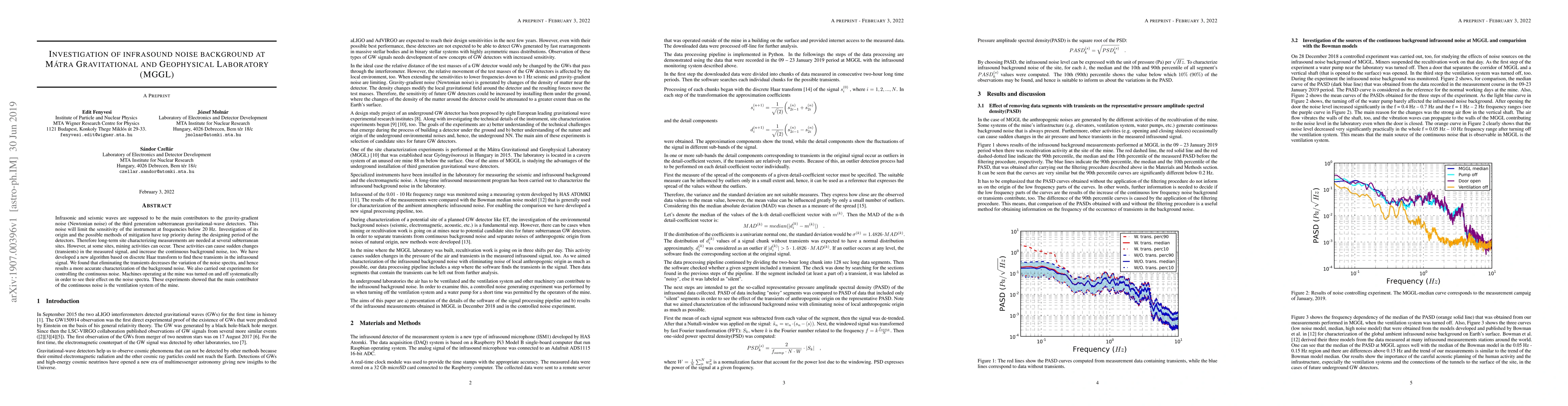 This study investigates infrasound noise at M'atra Gravitational and Geophysical Laboratory (MGGL), identifying mining activities as main contributors. A new algorithm using discrete Haar transform was developed to detect transients in infrasound signals, reducing noise variation and improving background noise characterization. Experiments revealed the ventilation system as the primary source of continuous noise.