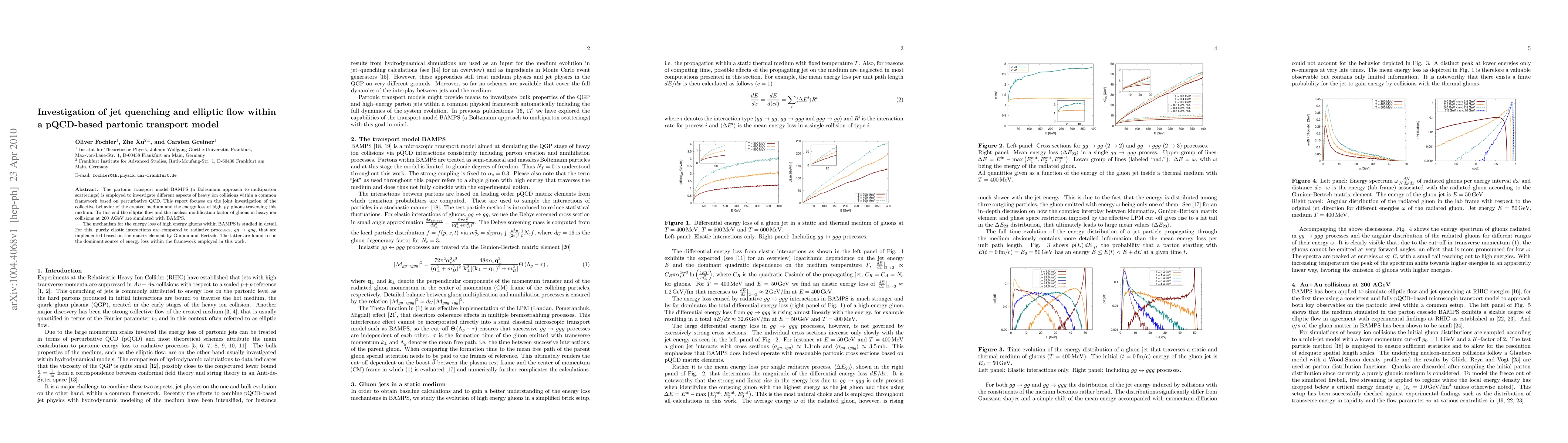 The partonic transport model BAMPS (a Boltzmann approach to multiparton scatterings) is employed to investigate different aspects of heavy ion collisions within a common framework based on perturbative QCD. This report focuses on the joint investigation of the collective behavior of the created medium and the energy loss of high-pT gluons traversing this medium. To this end the elliptic flow and the nuclear modification factor of gluons in heavy ion collisions at 200 AGeV are simulated with BAMPS. The mechanism for the energy loss of high energy gluons within BAMPS is studied in detail. For this, purely elastic interactions are compared to radiative processes, gg -> ggg, that are implemented based on the matrix element by Gunion and Bertsch. The latter are found to be the dominant source of energy loss within the framework employed in this work.