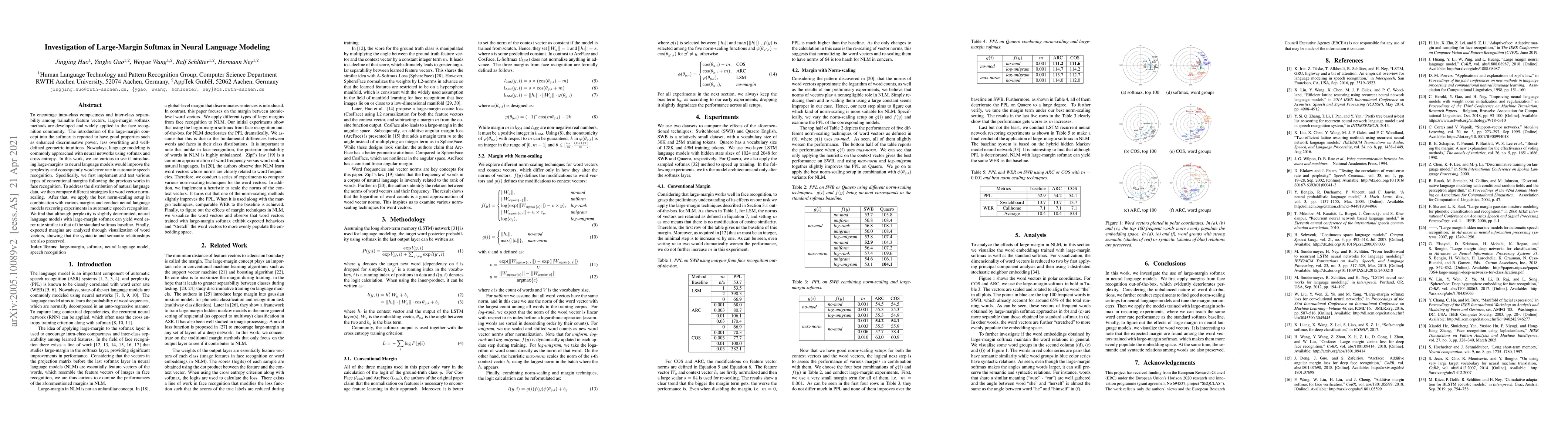 The paper investigates the application of large-margin softmax in neural language models (NLM). It begins by applying face recognition margins out-of-the-box, which deteriorates perplexity. Then, it explores norm-scaling techniques for NLM and tunes margin parameters. Finally, it visualizes word embeddings trained with large-margin softmax to analyze their effects.
