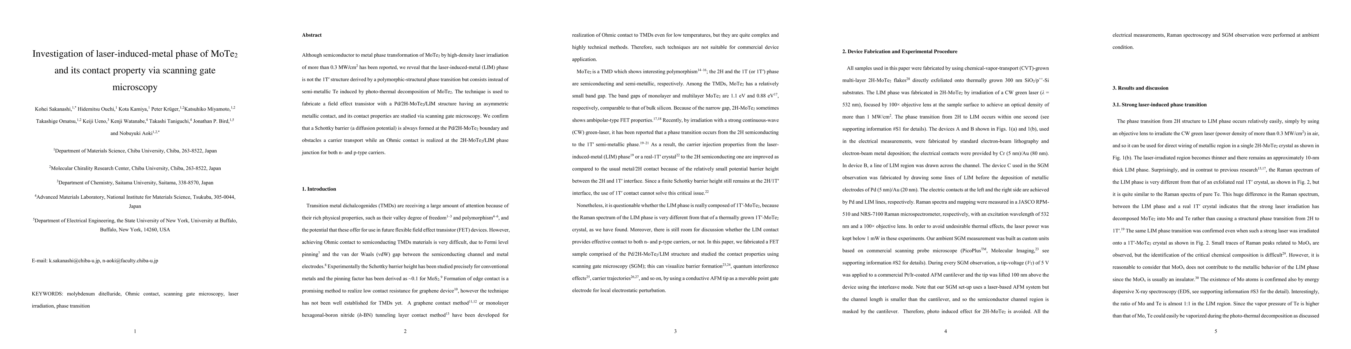 Although semiconductor to metal phase transformation of MoTe$_{2}$ by high-density laser irradiation of more than 0.3 MW/cm$^{2}$ has been reported, we reveal that the laser-induced-metal (LIM) phase is not the 1T' structure derived by a polymorphic-structural phase transition but consists instead of semi-metallic Te induced by photo-thermal decomposition of MoTe$_{2}$. The technique is used to fabricate a field effect transistor with a Pd/2H-MoTe$_{2}$/LIM structure having an asymmetric metallic contact, and its contact properties are studied via scanning gate microscopy. We confirm that a Schottky barrier (a diffusion potential) is always formed at the Pd/2H-MoTe$_{2}$ boundary and obstacles a carrier transport while an Ohmic contact is realized at the 2H-MoTe$_{2}$/LIM phase junction for both n- and p-type carriers.