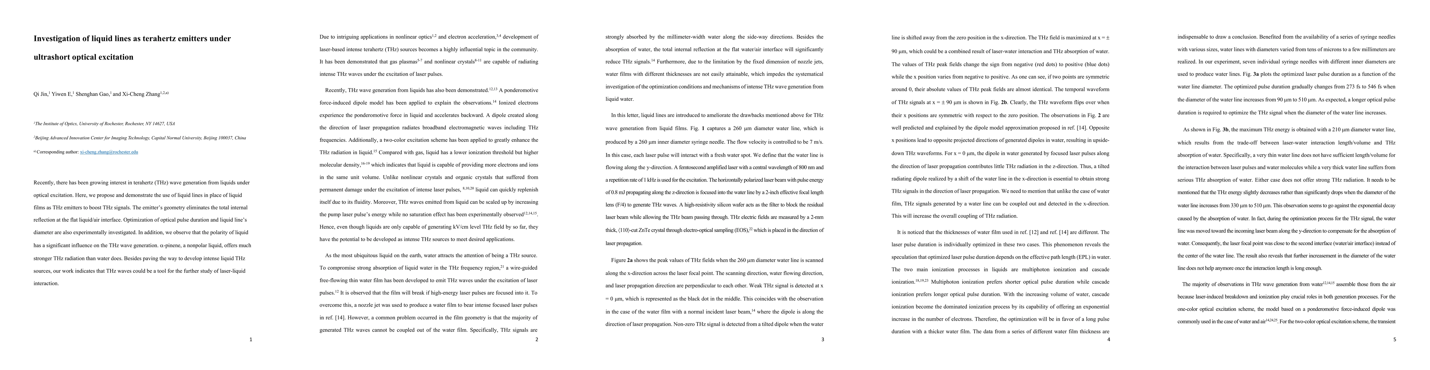 This paper investigates liquid lines as terahertz (THz) emitters under ultrashort optical excitation, demonstrating that they outperform liquid films by eliminating total internal reflection. The study finds that nonpolar liquids like alpha-pinene generate significantly stronger THz radiation compared to polar liquids like water.