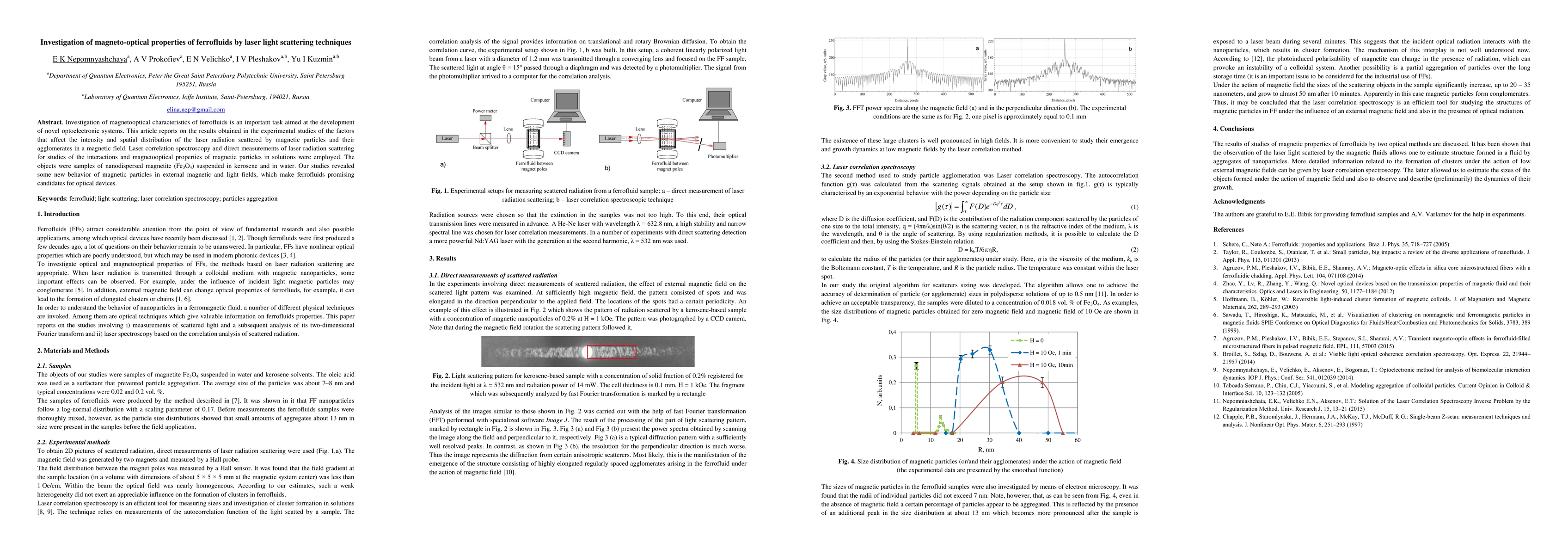Investigation of magnetooptical characteristics of ferrofluids is an important task aimed at the development of novel optoelectronic systems. This article reports on the results obtained in the experimental studies of the factors that affect the intensity and spatial distribution of the laser radiation scattered by magnetic particles and their agglomerates in a magnetic field. Laser correlation spectroscopy and direct measurements of laser radiation scattering for studies of the interactions and magnetooptical properties of magnetic particles in solutions were employed. The objects were samples of nanodispersed magnetite (Fe3O4) suspended in kerosene and in water. Our studies revealed some new behavior of magnetic particles in external magnetic and light fields, which make ferrofluids promising candidates for optical devices.