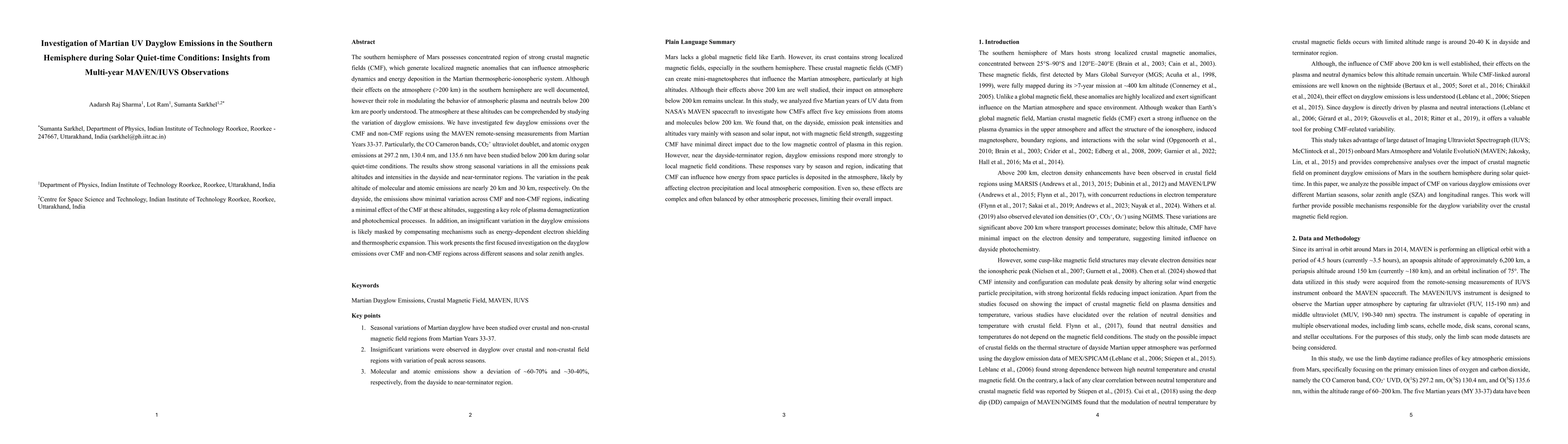 The study utilized MAVEN/IUVS remote-sensing measurements from Martian Years 33-37 to investigate dayglow emissions over crustal magnetic field (CMF) and non-CMF regions in the southern hemisphere of Mars.