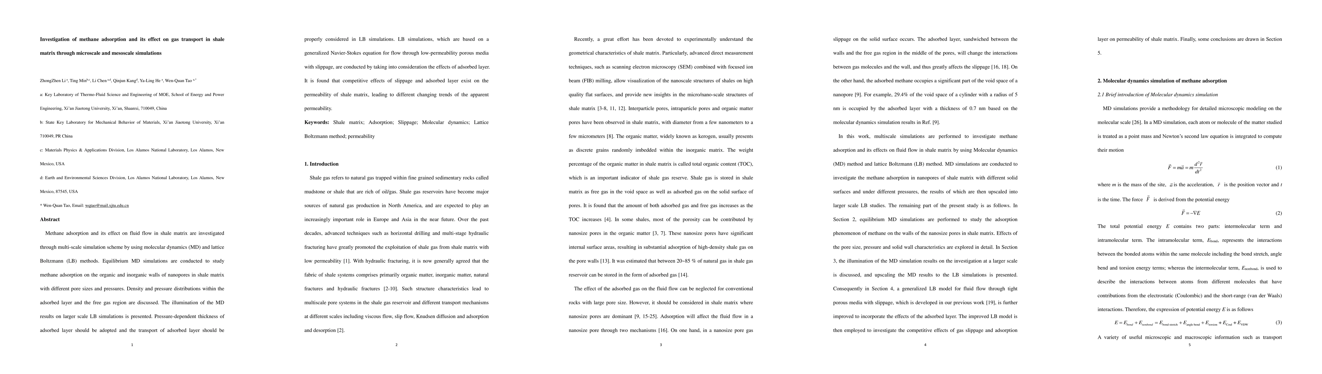 This paper investigates methane adsorption and its impact on gas transport in shale matrix using molecular dynamics and lattice Boltzmann simulations. The study reveals that the pressure-dependent thickness of the adsorbed layer and its transport must be considered in mesoscale simulations, leading to varying trends in apparent permeability due to competitive effects of slippage and the adsorbed layer.