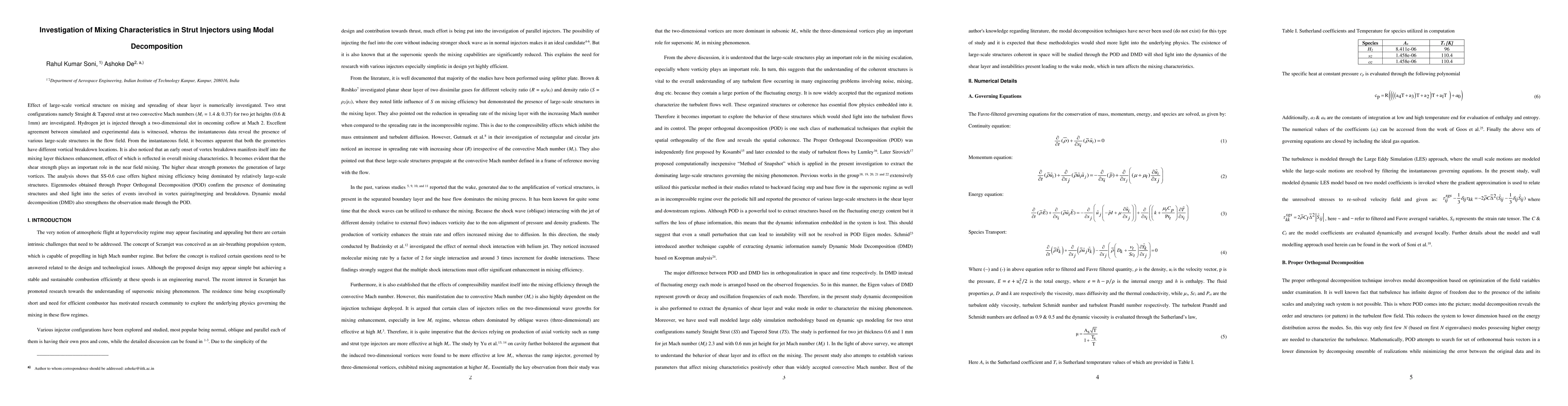 Effect of large-scale vortical structure on mixing and spreading of shear layer is numerically investigated. Two strut configurations namely Straight & Tapered strut at two convective Mach numbers (Mc = 1.4 & 0.37) for two jet heights (0.6 & 1mm) are investigated. Hydrogen jet is injected through a two-dimensional slot in oncoming coflow at Mach 2. Excellent agreement between simulated and experimental data is witnessed, whereas the instantaneous data reveal the presence of various large-scale structures in the flow field. From the instantaneous field, it becomes apparent that both the geometries have different vortical breakdown locations. It is also noticed that an early onset of vortex breakdown manifests itself into the mixing layer thickness enhancement, effect of which is reflected in overall mixing characteristics. It becomes evident that the shear strength plays an important role in the near field mixing. The higher shear strength promotes the generation of large vortices. The analysis shows that SS-0.6 case offers highest mixing efficiency being dominated by relatively large-scale structures. Eigenmodes obtained through Proper Orthogonal Decomposition (POD) confirm the presence of dominating structures and shed light into the series of events involved in vortex pairing/merging and breakdown. Dynamic modal decomposition (DMD) also strengthens the observation made through the POD.