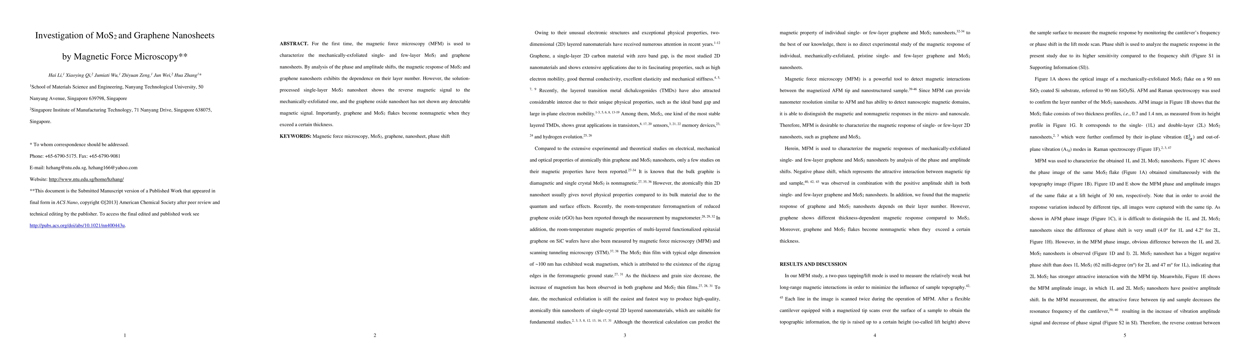 This study employs magnetic force microscopy (MFM) to characterize the magnetic properties of mechanically-exfoliated single- and few-layer MoS2 and graphene nanosheets, revealing a dependence on layer number. Notably, solution-processed single-layer MoS2 exhibits a reverse magnetic signal compared to mechanically-exfoliated samples, while graphene oxide shows no detectable magnetic signal, and both materials lose magnetism beyond a certain thickness.