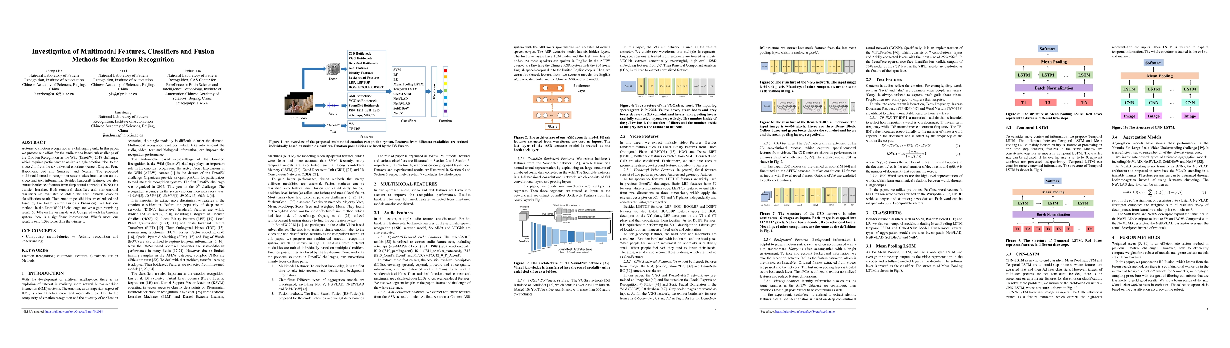 This paper investigates multimodal features, classifiers, and fusion methods for automatic emotion recognition using audio, video, and text. The proposed system, which extracts features from both handcrafted and deep learning approaches, achieved 60.34% accuracy in the EmotiW 2018 challenge, demonstrating a significant improvement over the baseline and competitive results.