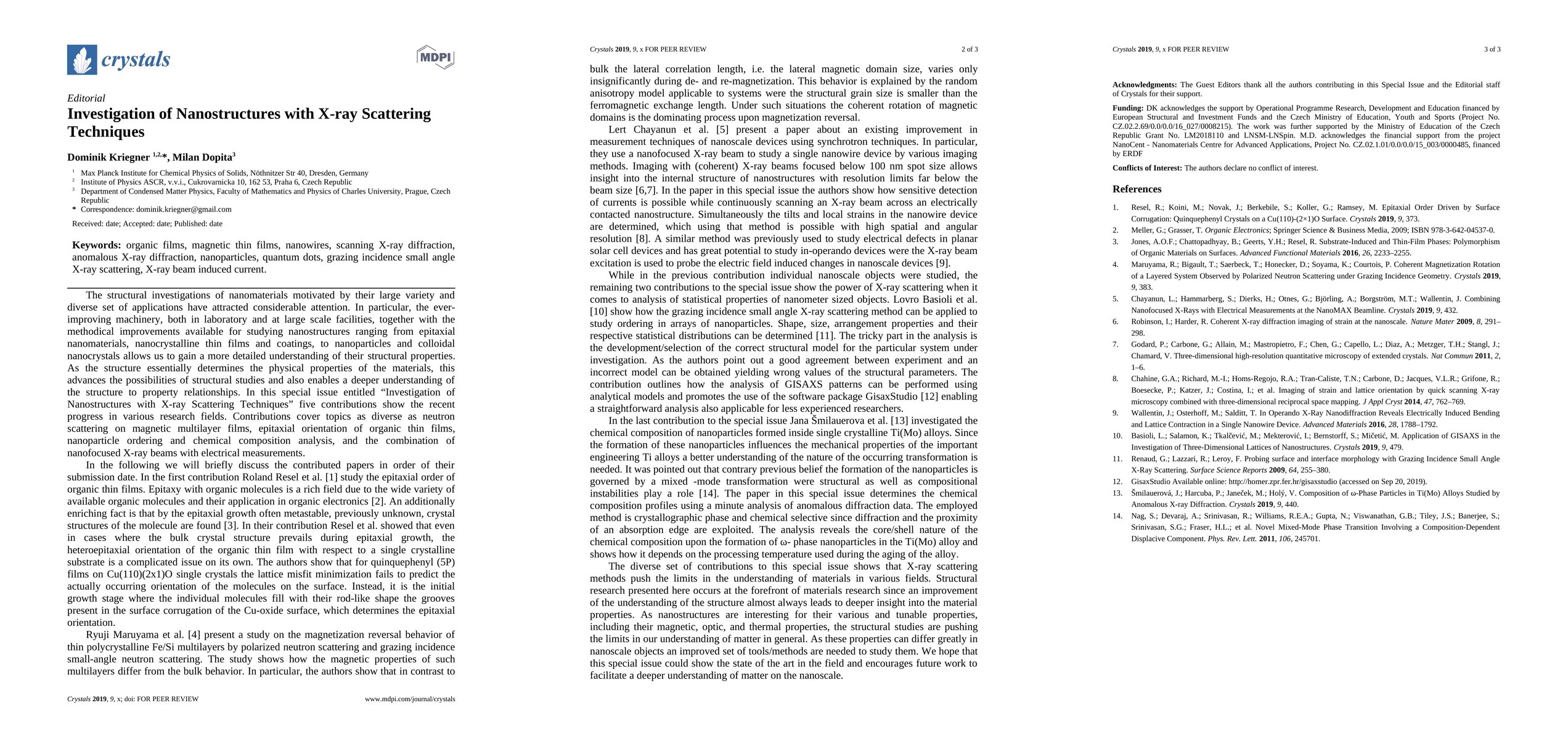 The structural investigations of nanomaterials motivated by their large variety and diverse set of applications have attracted considerable attention. In particular, the ever-improving machinery, both in laboratory and at large scale facilities, together with the methodical improvements available for studying nanostructures ranging from epitaxial nanomaterials, nanocrystalline thin films and coatings, to nanoparticles and colloidal nanocrystals allows us to gain a more detailed understanding of their structural properties. As the structure essentially determines the physical properties of the materials, this advances the possibilities of structural studies and also enables a deeper understanding of the structure to property relationships. In this special issue entitled "Investigation of Nanostructures with X-ray Scattering Techniques" five contributions show the recent progress in various research fields. Contributions cover topics as diverse as neutron scattering on magnetic multilayer films, epitaxial orientation of organic thin films, nanoparticle ordering and chemical composition analysis, and the combination of nanofocused X-ray beams with electrical measurements.