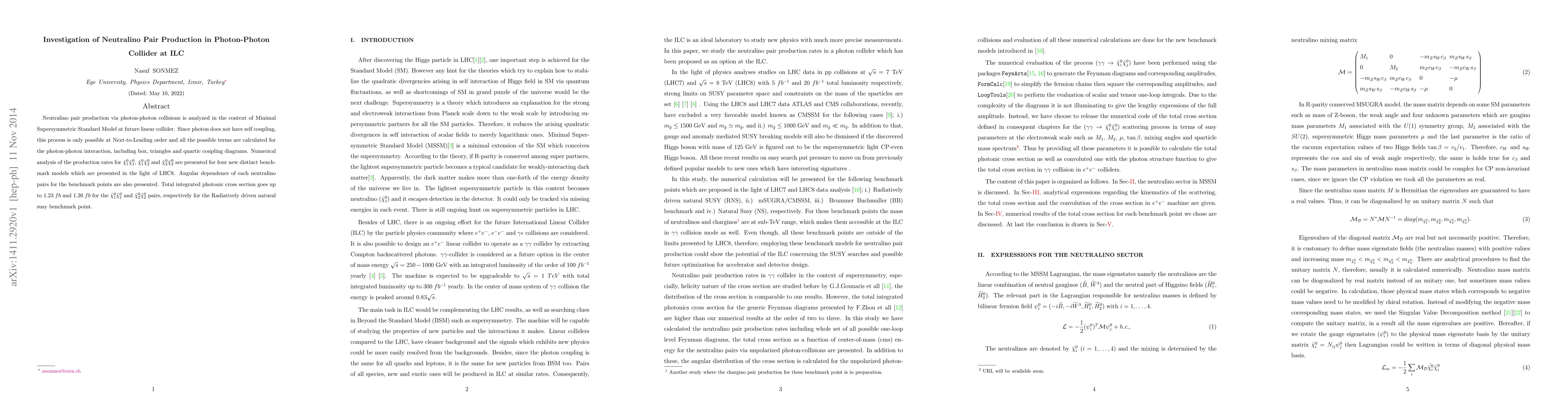 Neutralino pair production via photon-photon collisions is analyzed in the context of Minimal Supersymmetric Standard Model at future linear collider. Since photon does not have self coupling, this process is only possible at Next-to-Leading order and all the possible terms are calculated for the photon-photon interaction, including box, triangles and quartic coupling diagrams. Numerical analysis of the production rates for $ \tilde{\chi}^0_1 \tilde{\chi}^0_1$, $ \tilde{\chi}^0_1 \tilde{\chi}^0_2$ and $ \tilde{\chi}^0_2 \tilde{\chi}^0_2$ are presented for four new distinct benchmark models which are presented in the light of LHC8. Angular dependence of each neutralino pairs for the benchmark points are also presented. Total integrated photonic cross section goes up to $1.23\;fb$ and $1.26\;fb$ for the $ \tilde{\chi}^0_1 \tilde{\chi}^0_1$ and $ \tilde{\chi}^0_2 \tilde{\chi}^0_2$ pairs, respectively for the Radiatively driven natural susy benchmark point.