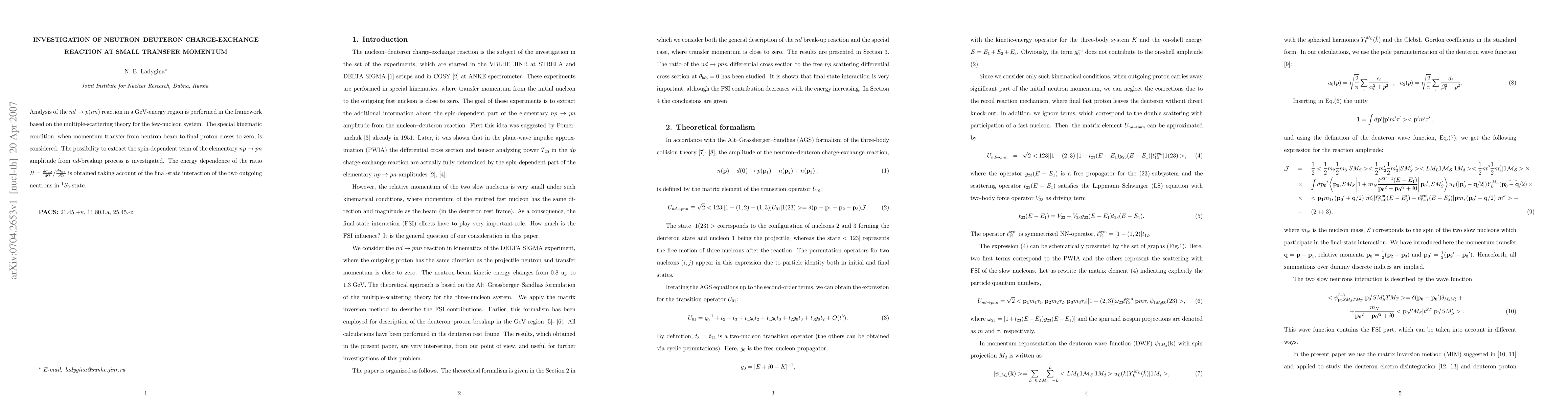 Analysis of the $nd\to p(nn)$ reaction in a GeV-energy region is performed in the framework based on the multiple-scattering theory for the few-nucleon system. The special kinematic condition, when momentum transfer from neutron beam to final proton closes to zero, is considered. The possibility to extract the spin-dependent term of the elementary $np\to pn $ amplitude from $nd$-breakup process is investigated. The energy dependence of the ratio $R=\frac{d\sigma_{nd}} {d\Omega} / \frac{d\sigma_{np}}{d\Omega}$ is obtained taking account of the final-state interaction of the two outgoing neutrons in $^1 S_0$-state.