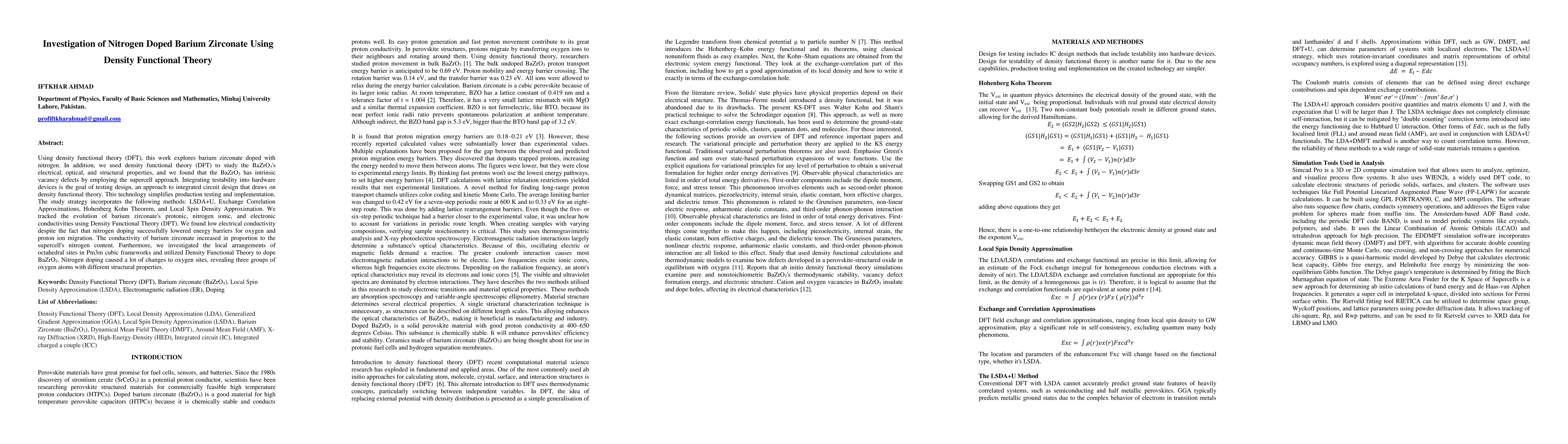 Using density functional theory (DFT), this work explores barium zirconate doped with nitrogen. In addition, we used density functional theory (DFT) to study the BaZrO$_3$'s electrical, optical, and structural properties, and we found that the BaZrO$_3$ has intrinsic vacancy defects by employing the supercell approach. Integrating testability into hardware devices is the goal of testing design, an approach to integrated circuit design that draws on density functional theory. This technology simplifies production testing and implementation. The study strategy incorporates the following methods: LSDA+U, Exchange Correlation Approximations, Hohenberg Kohn Theorem, and Local Spin Density Approximation. We tracked the evolution of barium zirconate's protonic, nitrogen ionic, and electronic conductivities using Density Functional Theory (DFT). We found low electrical conductivity despite the fact that nitrogen doping successfully lowered energy barriers for oxygen and proton ion migration. The conductivity of barium zirconate increased in proportion to the supercell's nitrogen content. Furthermore, we investigated the local arrangements of octahedral sites in Pm3m cubic frameworks and utilized Density Functional Theory to dope BaZrO$_3$. Nitrogen doping caused a lot of changes to oxygen sites, revealing three groups of oxygen atoms with different structural properties.