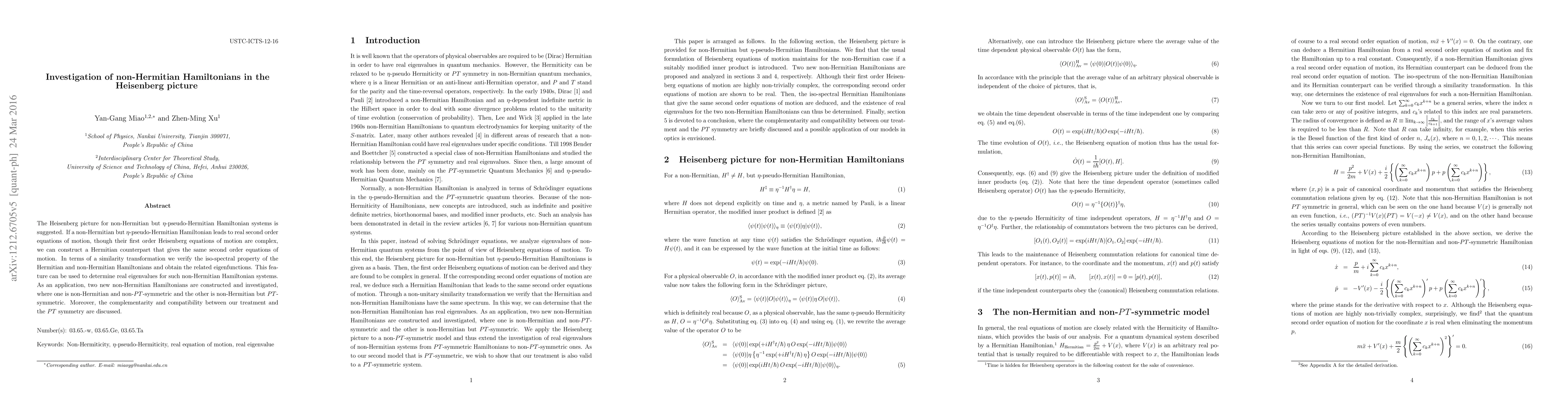 The Heisenberg picture for non-Hermitian but $\eta$-pseudo-Hermitian Hamiltonian systems is suggested. If a non-Hermitian but $\eta$-pseudo-Hermitian Hamiltonian leads to real second order equations of motion, though their first order Heisenberg equations of motion are complex, we can construct a Hermitian counterpart that gives the same second order equations of motion. In terms of a similarity transformation we verify the iso-spectral property of the Hermitian and non-Hermitian Hamiltonians and obtain the related eigenfunctions. This feature can be used to determine real eigenvalues for such non-Hermitian Hamiltonian systems. As an application, two new non-Hermitian Hamiltonians are constructed and investigated, where one is non-Hermitian and non-PT-symmetric and the other is non-Hermitian but PT-symmetric. Moreover, the complementarity and compatibility between our treatment and the PT symmetry are discussed.