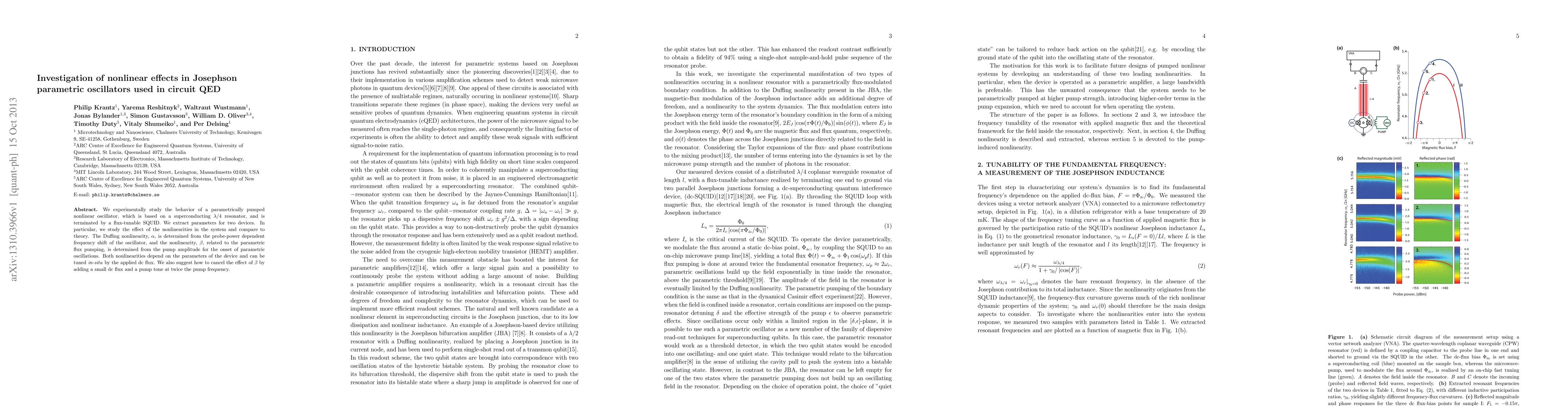 We experimentally study the behavior of a parametrically pumped nonlinear oscillator, which is based on a superconducting \lambda /4 resonator, and is terminated by a flux-tunable SQUID. We extract parameters for two devices. In particular, we study the effect of the nonlinearities in the system and compare to theory. The Duffing nonlinearity, \alpha, is determined from the probe-power dependent frequency shift of the oscillator, and the nonlinearity, \beta, related to the parametric flux pumping, is determined from the pump amplitude for the onset of parametric oscillations. Both nonlinearities depend on the parameters of the device and can be tuned in-situ by the applied dc flux. We also suggest how to cancel the effect of \beta by adding a small dc flux and a pump tone at twice the pump frequency.