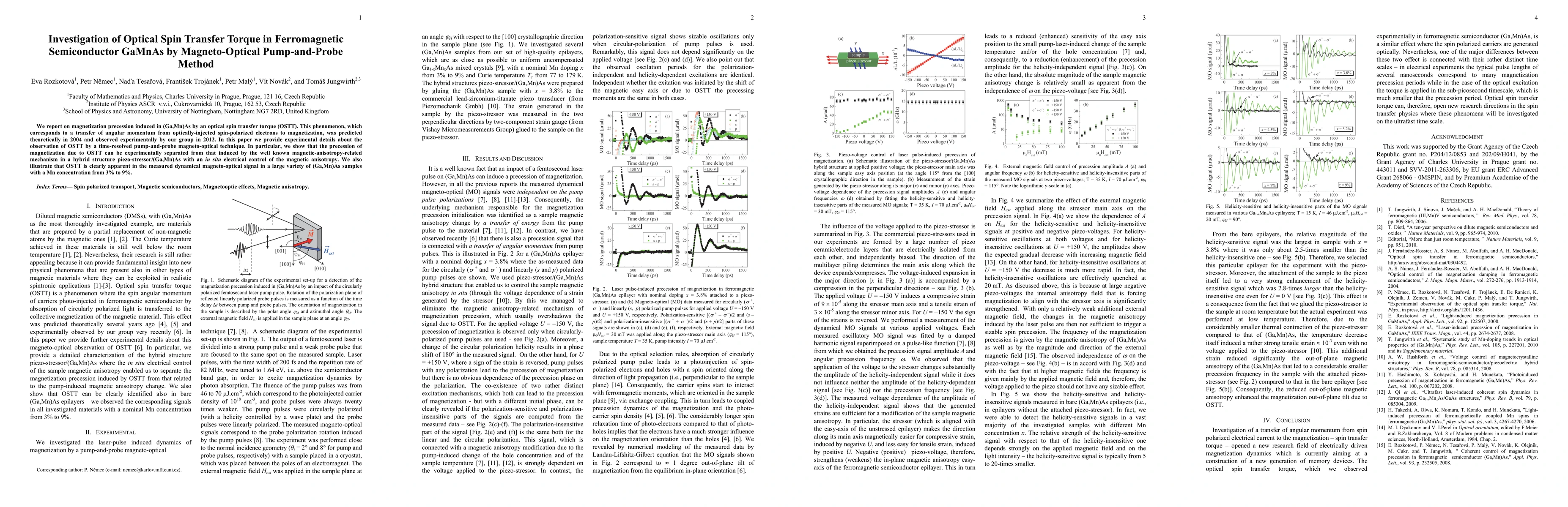 We report on magnetization precession induced in (Ga,Mn)As by an optical spin transfer torque (OSTT). This phenomenon, which corresponds to a transfer of angular momentum from optically-injected spin-polarized electrons to magnetization, was predicted theoretically in 2004 and observed experimentally by our group in 2012. In this paper we provide experimental details about the observation of OSTT by a time-resolved pump-and-probe magneto-optical technique. In particular, we show that the precession of magnetization due to OSTT can be experimentally separated from that induced by the well known magnetic-anisotropy-related mechanism in a hybrid structure piezo-stressor/(Ga,Mn)As with an in situ electrical control of the magnetic anisotropy. We also illustrate that OSTT is clearly apparent in the measured dynamical magneto-optical signal in a large variety of (Ga,Mn)As samples with a Mn concentration from 3% to 9%.