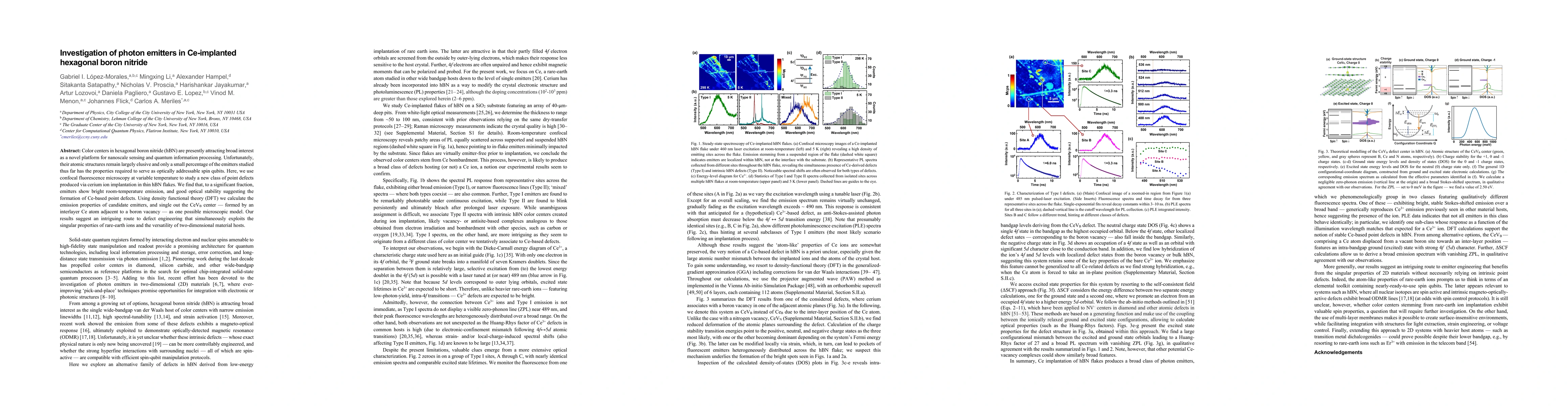 The paper investigates new photon emitters in Ce-implanted hexagonal boron nitride (hBN), finding a significant fraction of bright room-temperature emitters with good optical stability, suggesting Ce-based point defects. DFT calculations identify the CeVB center, an interlayer Ce atom adjacent to a boron vacancy, as a possible model, opening a route for defect engineering in 2D materials.