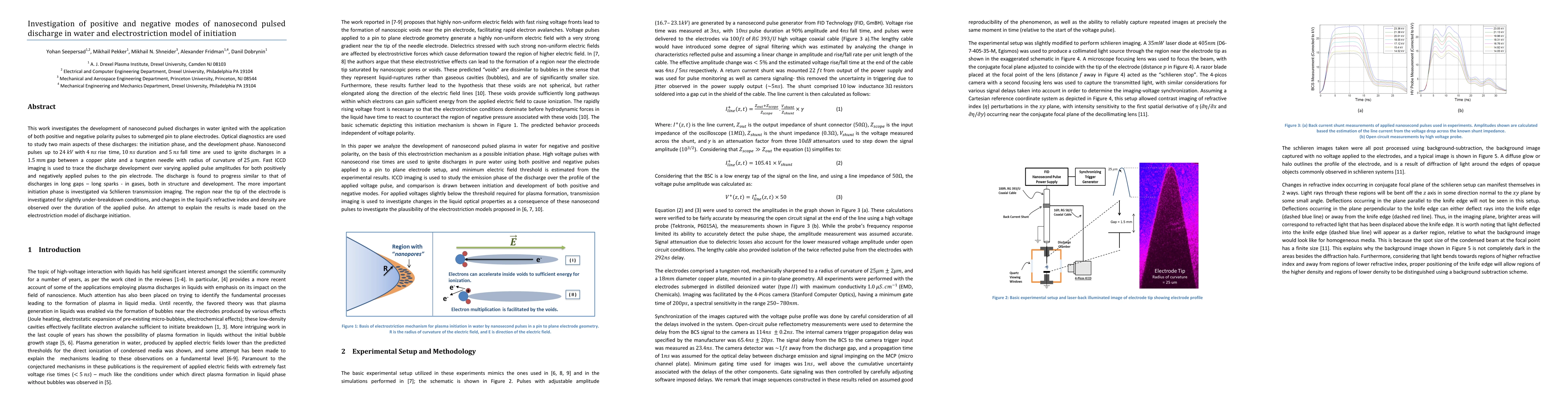 This paper investigates nanosecond pulsed discharges in water using positive and negative polarity pulses, employing optical diagnostics to study the initiation and development phases. The electrostriction model is proposed to explain the observed changes in the liquid's refractive index and density during discharge initiation.