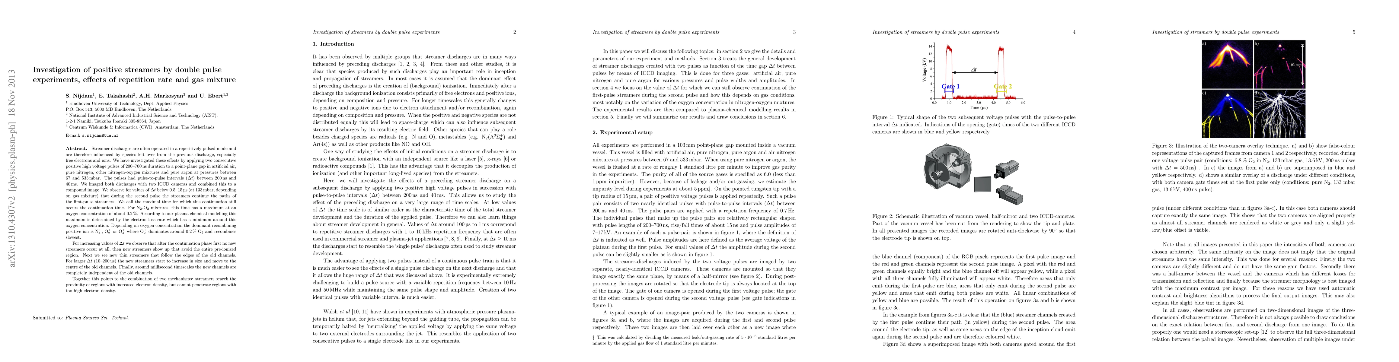 This study investigates the behavior of positive streamers in various gases under double pulse experiments, finding that the continuation time of streamers depends on the pulse interval and gas mixture. The second pulse often follows the path of the first, especially for short intervals, with the maximum continuation time occurring at around 0.2% oxygen concentration in N₂-O₂ mixtures due to the slowest recombination of O₂⁺ ions.
